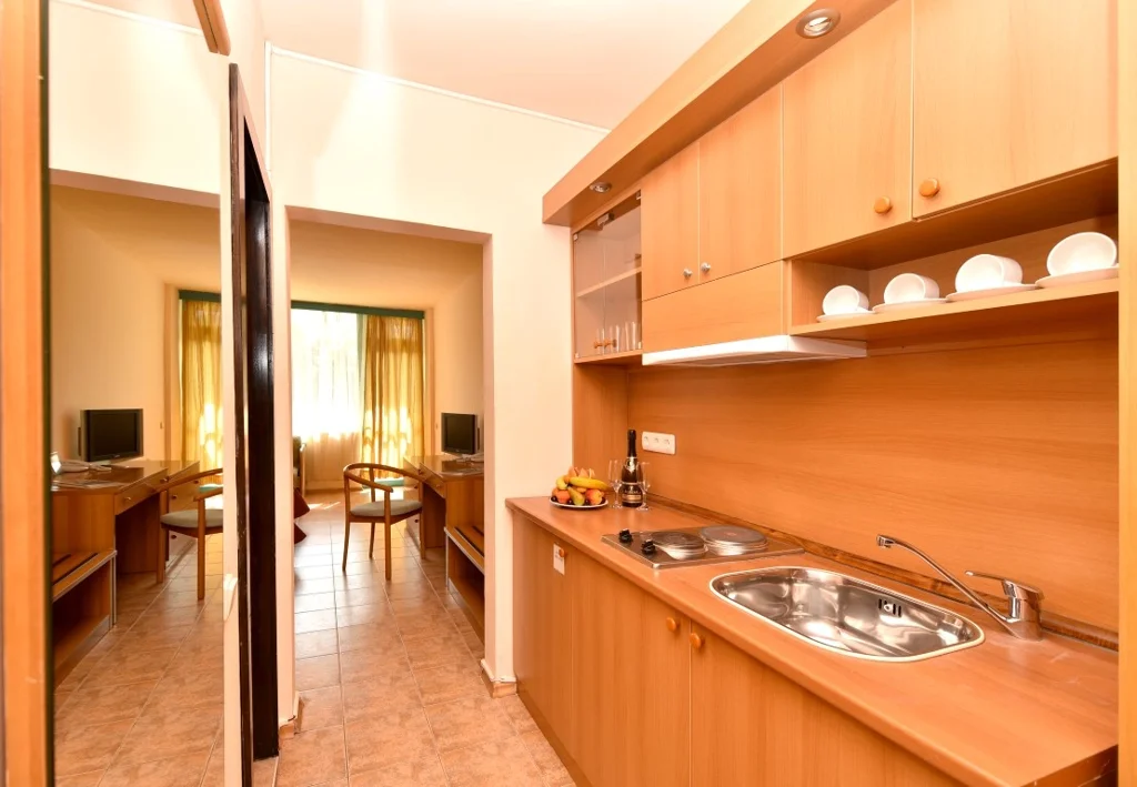 Apartament cu 1 Dormitor – 32 m², disponibil în 3 unități, cu living dotat cu canapea și dormitor separat, vedere centrală sau laterală la mare, capacitate maximă 2+2 persoane. Dotările includ aer condiționat, TV prin cablu, frigider, minibar la cerere contra cost, balcon sau terasă, baie cu duș sau cadă, uscător de păr, seif contra cost și facilități pentru cafea și ceai la cerere. Cea mai spațioasă opțiune din hotel, recomandată familiilor sau turiștilor care doresc mai mult confort.