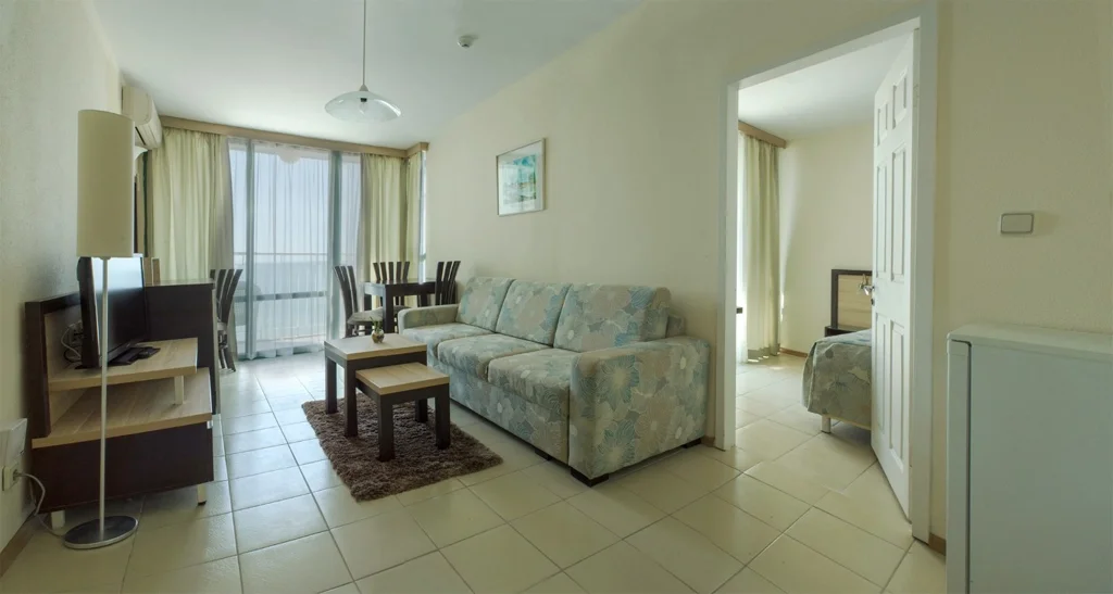 Apartament cu 1 Dormitor – 36 m², capacitate maximă 2+2 persoane, compus din living și un dormitor. Două dintre aceste apartamente sunt situate la primul etaj, iar celelalte două la etajul 10, oferind o priveliște deosebită. Dotările includ aer condiționat individual, televizor LCD prin satelit, telefon, minibar la cerere (contra cost), frigider, internet LAN gratuit, baie cu duș și cadă, halat de baie și papuci la cerere, uscător de păr și balcon. Curățenia zilnică și schimbarea lenjeriei de două ori pe săptămână sunt incluse.