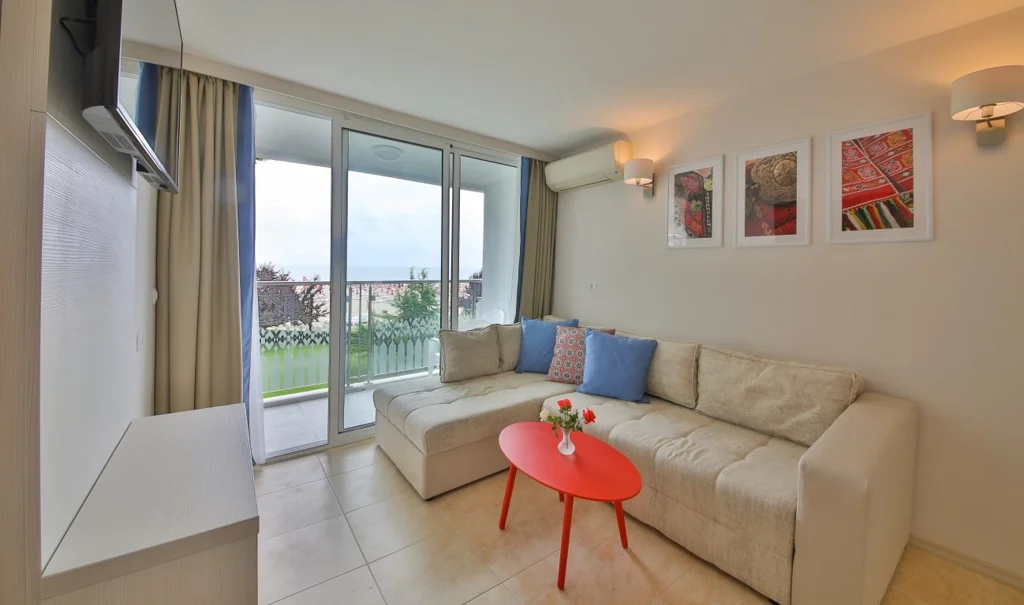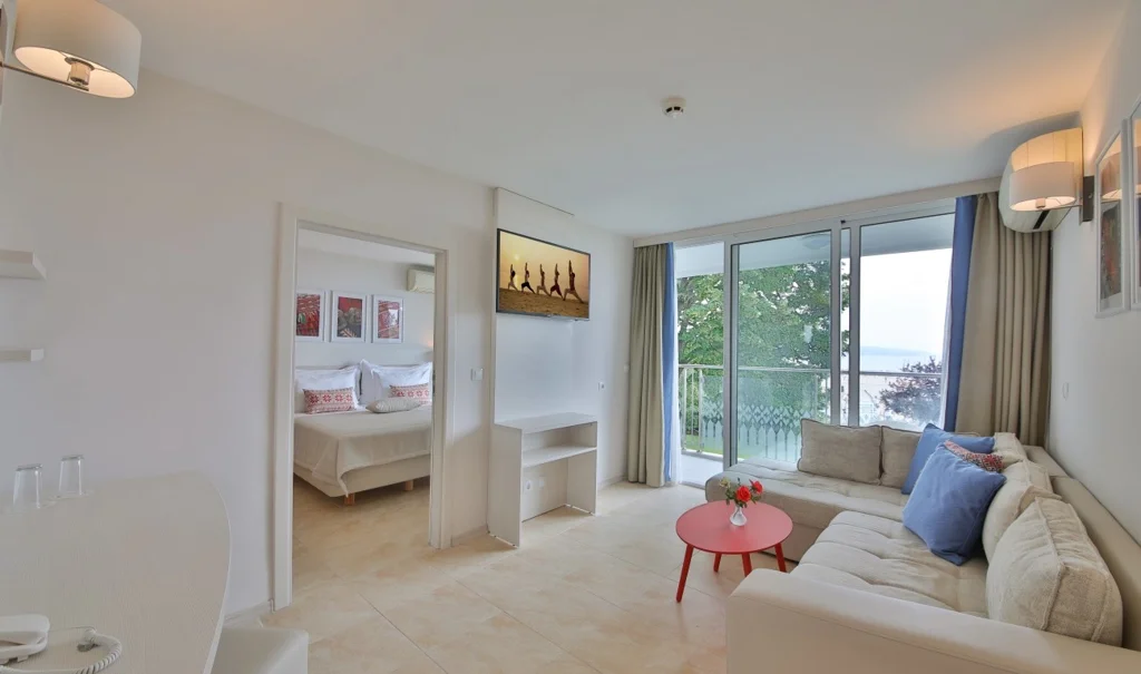 Apartament cu 1 Dormitor – 37 m², pentru maximum 2+2/3 persoane, format dintr-un living cu canapea extensibilă și un dormitor separat cu pat dublu, conectate printr-o ușă interioară. Dotările sunt identice cu cele ale camerei duble: aer condiționat individual, TV prin cablu, Wi-Fi gratuit, minibar gratuit cu reaprovizionare zilnică, seif, telefon, radio și balcon mobilat. Baia cu duș/cabină de duș, produse cosmetice și prosoape completează confortul acestei opțiuni generoase, ideale pentru familii.