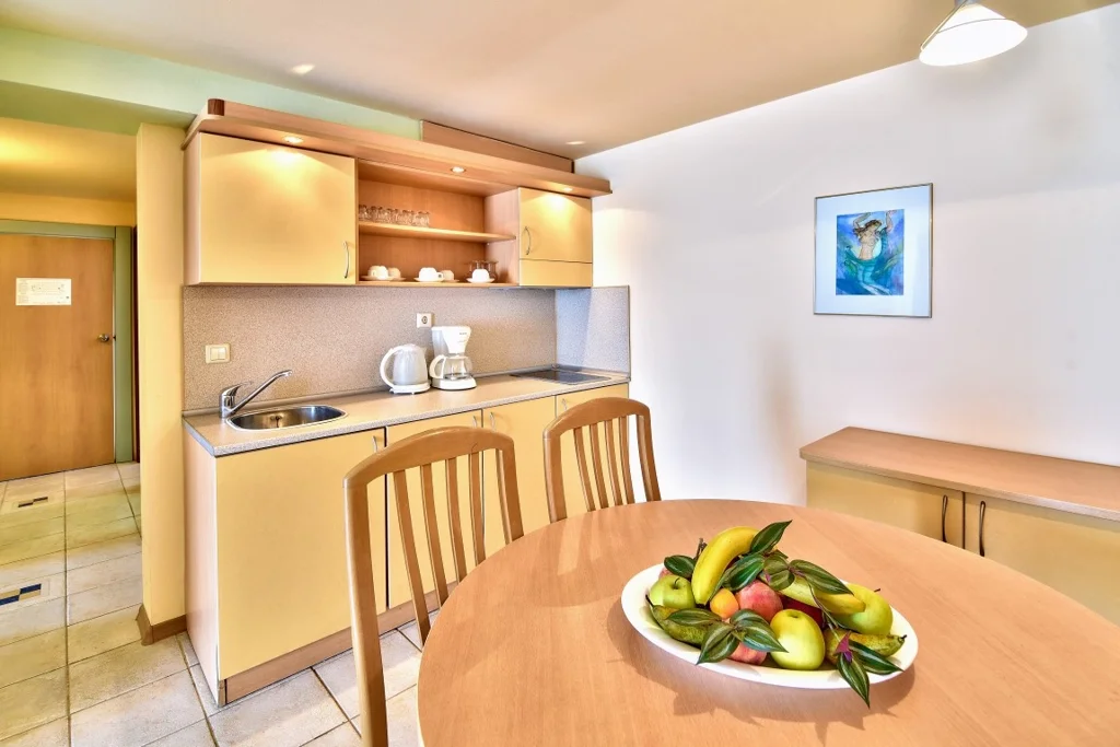 Apartamentul cu 2 Dormitoare – cu o suprafață generoasă de 100 m² și o capacitate de până la 8 persoane, apartamentul cuprinde un living și două dormitoare separate, perfect pentru grupuri sau familii extinse. Dotările includ aer condiționat, televiziune prin cablu, telefon, chicineta utilată, două băi cu cadă și balcon. Vederea este spre terenul de tenis. Această opțiune de cazare oferă confort și spațiu la standarde superioare în cadrul hotelului Kaliopa.