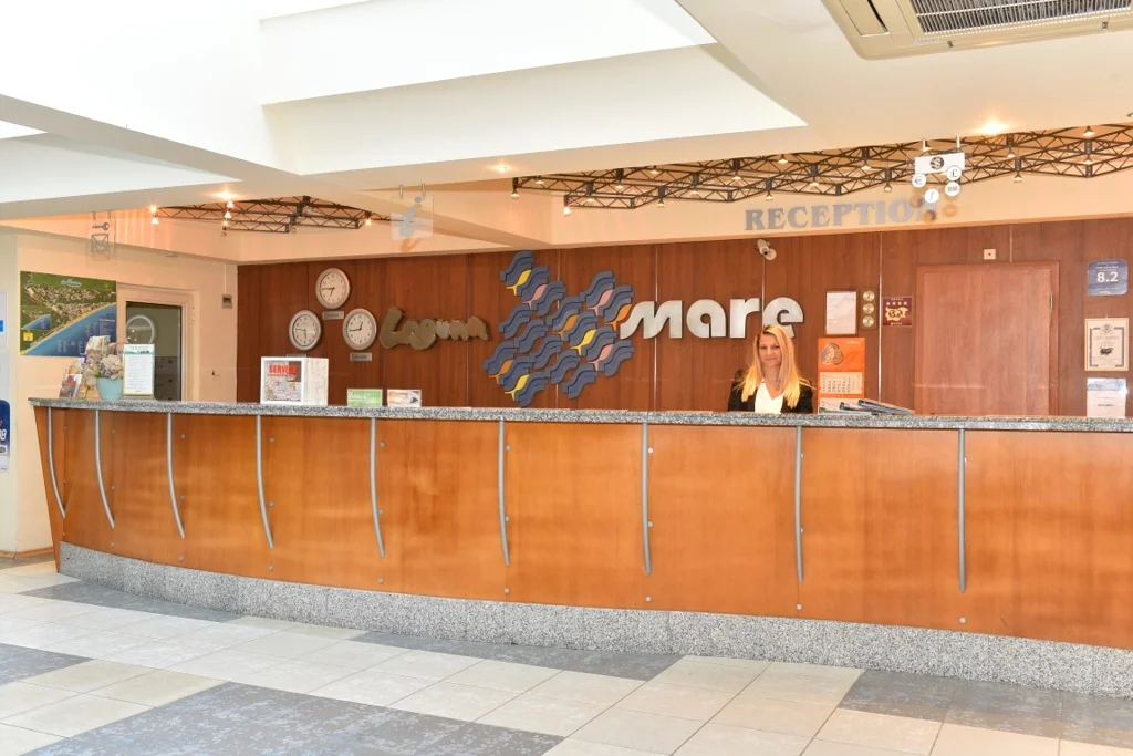 Hotelul Laguna Mare pune la dispoziția oaspeților o infrastructură completă pentru un sejur confortabil. Printre facilitățile disponibile se numără o piscină în aer liber (la hotelul Laguna Garden din cadrul complexului), cu șezlonguri și umbrele gratuite în limita disponibilității, precum și o cafenea și un mini-market. Wi-Fi-ul este gratuit pe toată durata sejurului. Hotelul oferă, de asemenea, servicii de spălătorie și curățătorie chimică (contra cost), un magazin de suveniruri, cameră de bagaje și parcare auto nepăzită disponibilă pe bază de abonament pe durata sejurului (contra cost). Centrul Spa, salonul de înfrumusețare și coaforul sunt disponibile contra cost. Animale de companie sunt acceptate cu o taxă suplimentară de 50 BGN/zi. Recepția și serviciile de bază sunt disponibile conform programului standard, cu check-in după ora 14:00 și check-out până la ora 12:00.