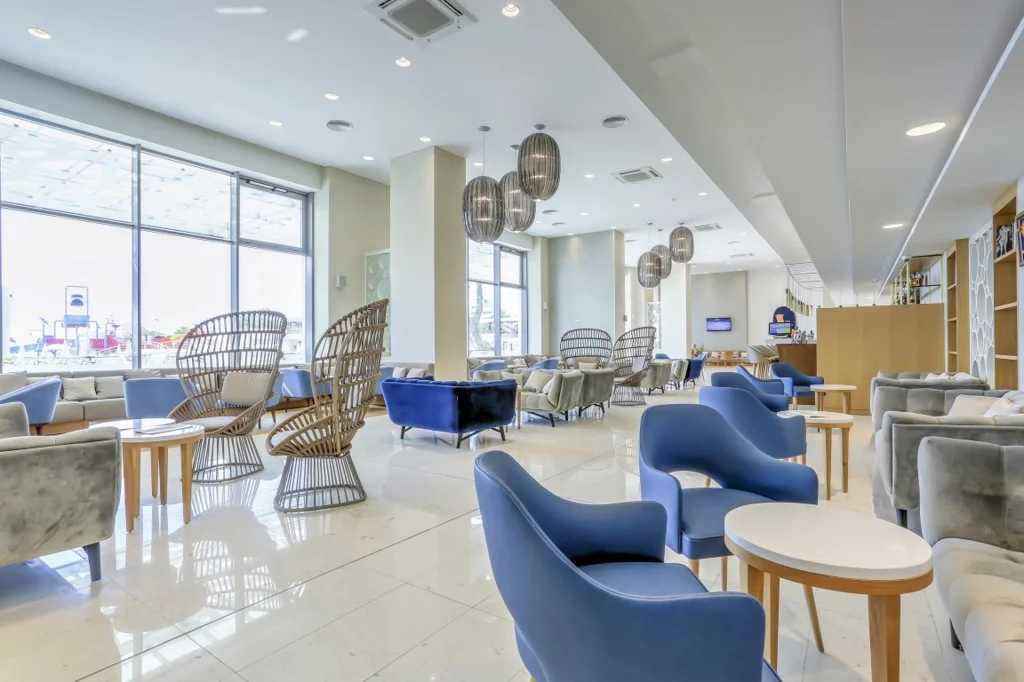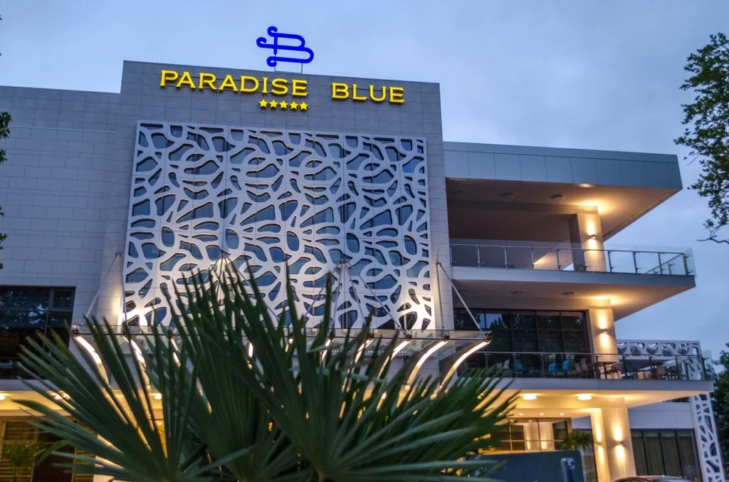 Maritim Hotel Paradise Blue pune la dispoziția oaspeților o infrastructură completă de 5 stele. Restaurantul principal tip bufet „Blue Essential" asigură mesele incluse în pachet (HB - mic dejun și cină), în timp ce restaurantul à la carte „Montgolfier" oferă o experiență gastronomică rafinată. Barul din hol și barul de la piscină completează oferta de food & beverage, alături de terase generoase. Pentru evenimentele de business, hotelul dispune de 3 săli de conferințe complet echipate: „Sea" (500 locuri), „Sky" (140 locuri) și „Wind" (80 locuri). Centrul SPA și Wellness include piscină interioară cu sistem de încălzire, saună, baie de aburi și Jacuzzi, toate disponibile contra cost. Wi-Fi gratuit în tot hotelul, parcare subterană (abonament contra cost), room service contra cost, club de noapte, schimb valutar, magazin de suveniruri, servicii de spălătorie și curățătorie chimică (contra cost) și cameră de bagaje. Recepția se află la etajul 8, check-in de la ora 14:00, check-out până la ora 12:00. Animalele de companie nu sunt permise.