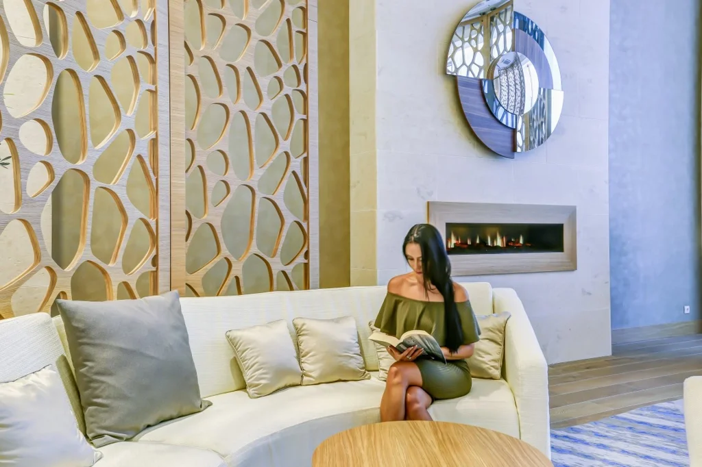 Apartament Executive - 46 m², situat la etajele 8 și 9, cu vedere la mare. Cel mai spațios tip de cazare din hotel, compus din living cu zonă de relaxare, zonă de masă pentru 4 persoane și chicinetă (frigider, plite ceramice, ustensile), canapea extensibilă și dormitor cu paturi twin. Două băi complete, balcon cu grădină privată și șezlonguri, mobilier de designer, Wi-Fi gratuit, seif gratuit. Perfecte pentru familii sau cupluri care caută lux autentic.