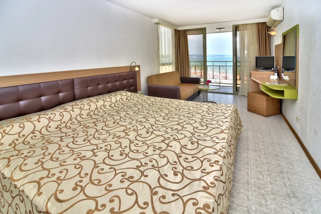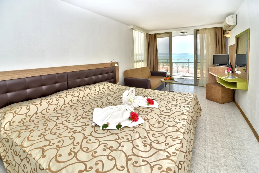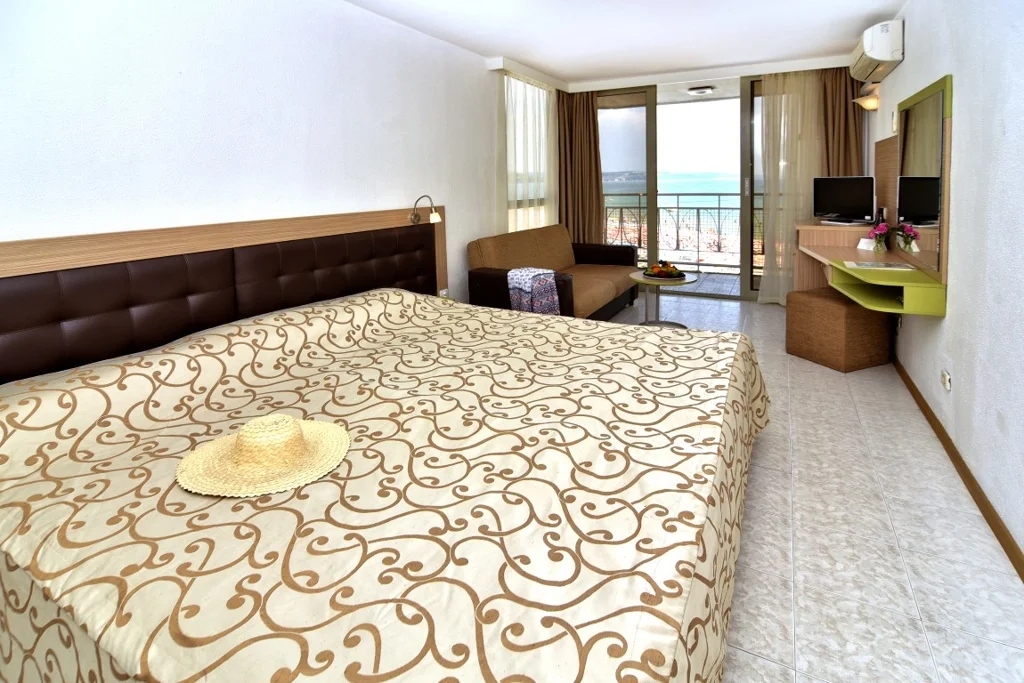 Apartament cu 1 dormitor – 35 m², capacitate maximă 2+2 persoane, compus din living și un dormitor, cu vedere la mare. Dotat cu aer condiționat individual, televiziune prin cablu, minibar (contra cost), telefon, Wi-Fi gratuit, baie cu duș sau cadă (la cerere), uscător de păr, balcon, fier de călcat și masă de călcat la cerere. Pardoseala din teracotă, curățenie zilnică și schimbarea lenjeriei de trei ori pe săptămână.