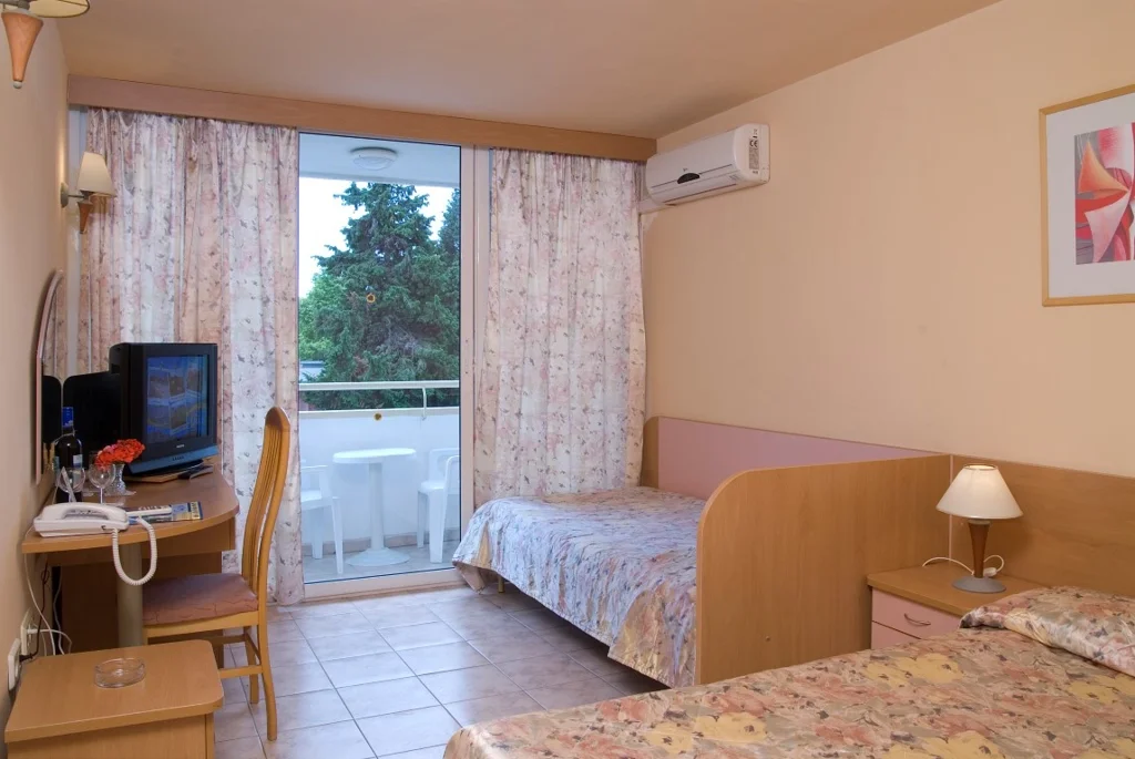Camera Standard – 13,5 m², capacitate maximă 2+1 persoane, dotată cu două paturi de o persoană și un fotoliu extensibil. Dispune de aer condiționat individual, televiziune prin cablu, Wi-Fi gratuit (disponibil în majoritatea camerelor), baie cu duș și uscător de păr la cerere, balcon mobilat și pardoseală din plăci ceramice. Vedere spre piscină sau parc. Curățenia se efectuează zilnic, lenjeria de pat se schimbă săptămânal, iar prosoapele la cerere sau zilnic.