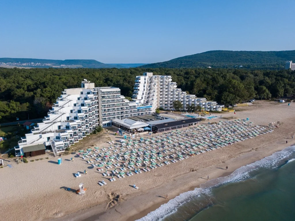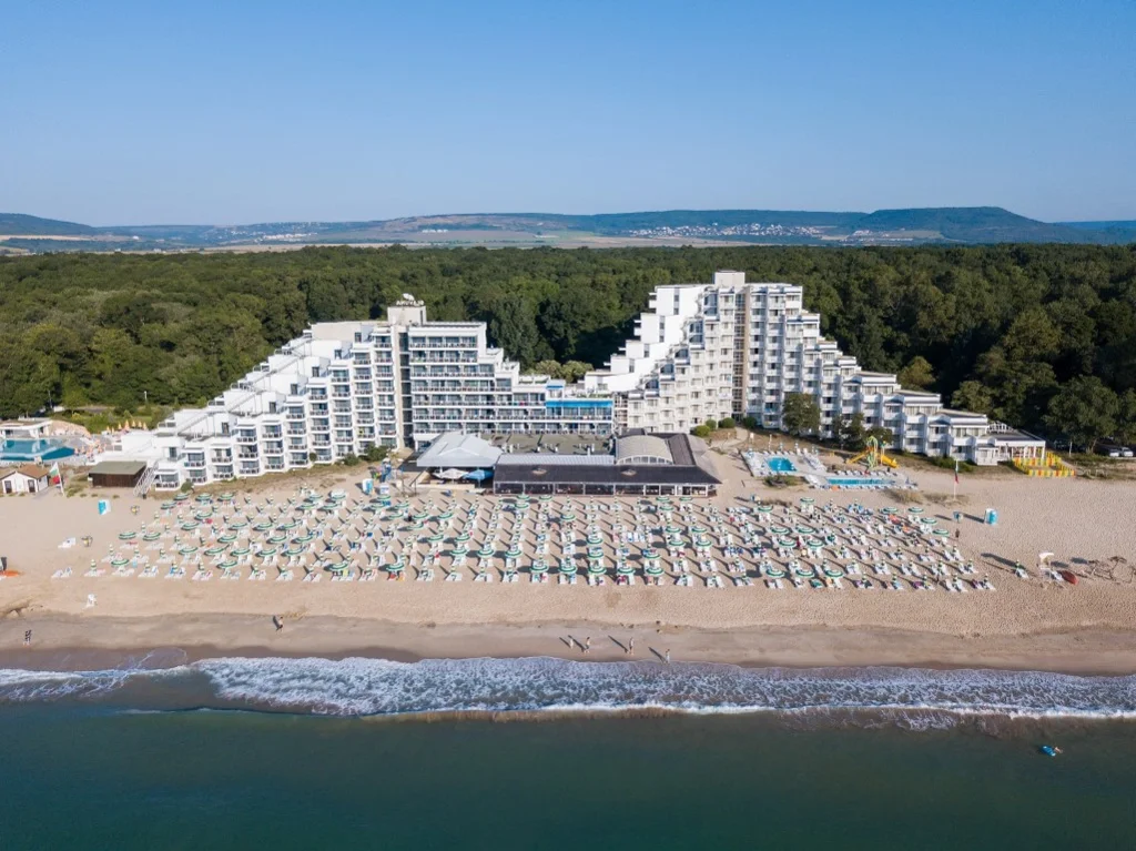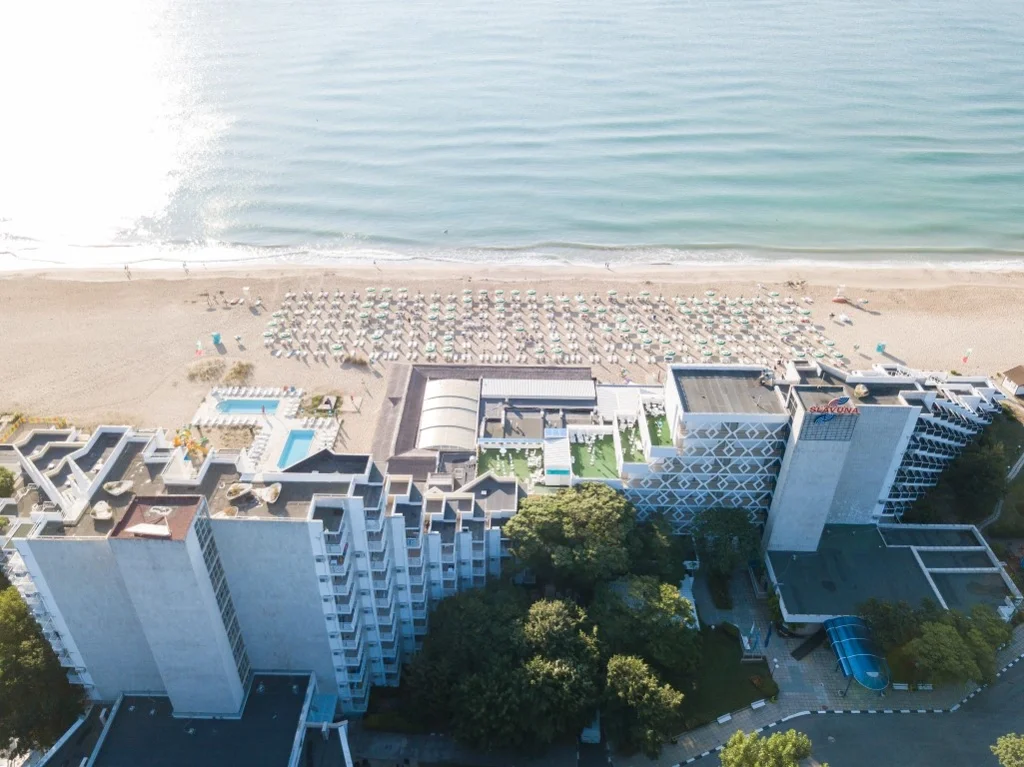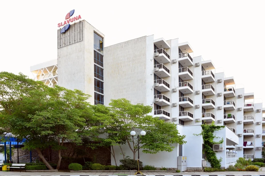 Hotel Slavuna este o alegere elegantă de 4 stele situată direct pe plaja de nisip a stațiunii Albena, una dintre cele mai apreciate destinații de pe litoralul bulgăresc. Renovat în 2008, hotelul îmbină confortul modern cu accesul privilegiat la una dintre cele mai frumoase plaje din Bulgaria, oferind un sejur complet în regim All Inclusive. Cu cele 8 etaje ale sale și o gamă variată de facilități partajate cu complexul din jur, Slavuna se adresează deopotrivă familiilor cu copii, cuplurilor și grupurilor care caută o vacanță fără griji.