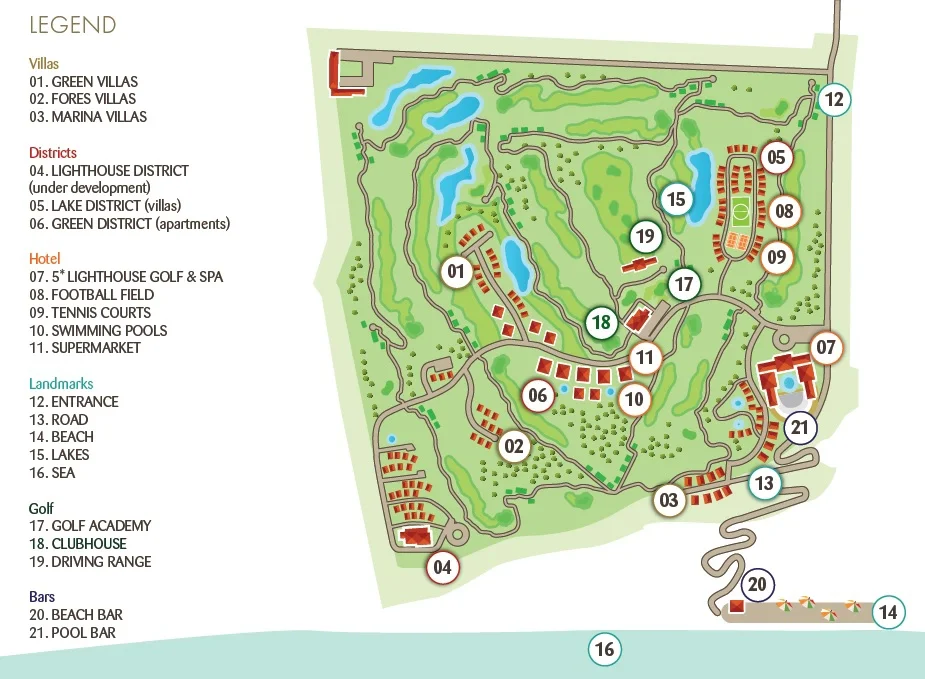 Atracția principală a hotelului este Terenul de Golf Lighthouse, proiectat de campionul mondial Ian Woosnam, cu 18 găuri, Par 71, lungime de 6.100 m și 5 lacuri ornamentale. Terenul este membru al BGA și EGA. Academia de Golf oferă antrenamente în română, engleză, bulgară și germană, teren de antrenament acoperit de 300 m cu 24 de locuri, zonă de joc scurt și zonă de buncăre, cu închiriere de echipament disponibilă. Gratuit sunt puse la dispoziție: fitness, tenis de masă, șah și accesul la facilitățile spa. Contra cost sunt disponibile: teren de tenis, teren de fotbal, sporturi nautice, biliard, minigolf, teren de petanque, închiriere biciclete, aerobic și gimnastică acvatică. Pentru familii, hotelul oferă un program de animație extins, club pentru copii, loc de joacă, meniu dedicat copiilor și program sezonier special. Babysittingul este disponibil contra cost.