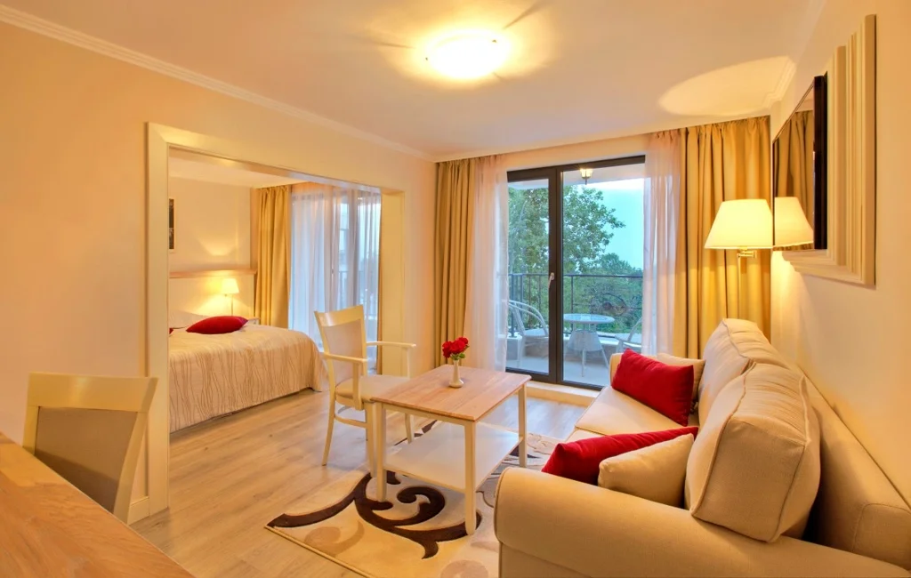 Junior Suite – 37 m², capacitate maximă 3 persoane (2+1), cu aceeași structură spațioasă ca și studioul: zonă de dormit cu pat dublu și zonă de living cu canapea extensibilă. Dotările sunt identice – aer condiționat, TV prin cablu, seif, Wi-Fi, mini-frigider, baie completă și balcon mobilat. Disponibil în două variante de vedere: cu vedere la parc sau cu vedere la mare, această din urmă variantă oferind un plus de romantism oricărei vacanțe.
