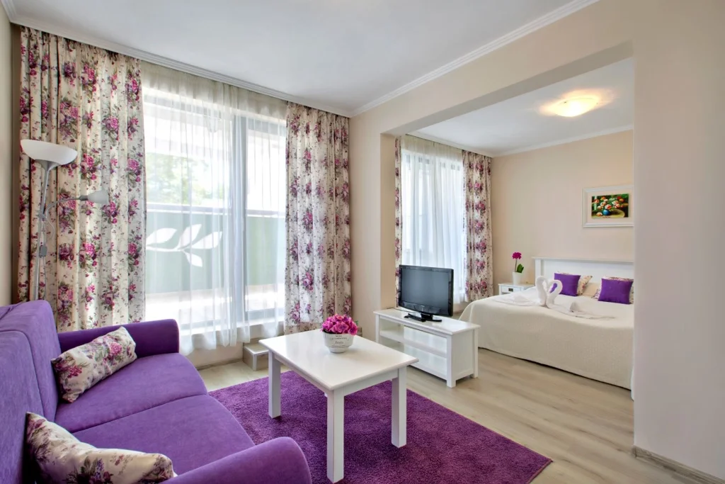 Apartamentul cu un dormitor – 42 m², capacitate maximă 4 persoane (2+2), este cea mai spațioasă opțiune de cazare din hotel. Spre deosebire de studiouri, apartamentul dispune de un dormitor și un living complet separate, cu ușă comunicantă. Include canapea extensibilă, aer condiționat individual, TV prin cablu, seif, Wi-Fi, mini-frigider, chicinetă, baie cu duș/cabină de duș, uscător de păr și balcon mobilat. Ideal pentru familii cu copii sau grupuri mici.