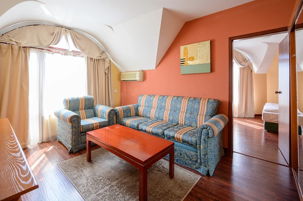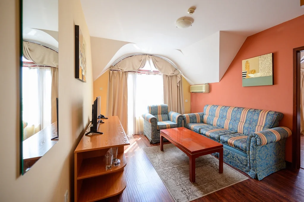 Apartament cu 1 dormitor – Apartamentele, în număr de 7, sunt ideale pentru familii sau grupuri mici, putând găzdui până la 4-5 persoane. Configurația include un living și un dormitor cu ușă comunicantă, un pat dublu și un pat suplimentar sub forma unei canapele extensibile. Dotările sunt similare cu cele ale camerei duble: aer condiționat central, TV cu ecran plat, canale prin cablu, aparat de cafea, minibar gol și balcon. Baia este echipată cu cadă (față de dușul din camera dublă), uscător de păr, prosoape și produse cosmetice. Seiful este contra cost, iar Wi-Fi-ul este gratuit. Curățenia și schimbarea lenjeriei urmează același ritm ca la camerele standard.