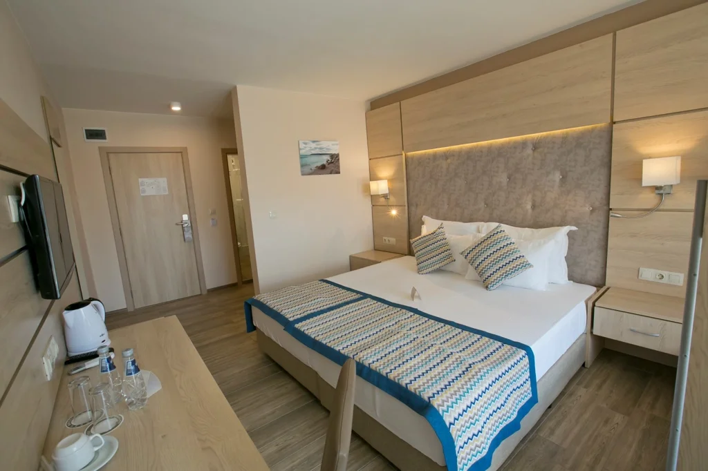 Royal Bay Resort & Aqua Park se remarcă prin accesul direct la plaja cu nisip, renovarea recentă din 2023 și oferta All Inclusive generoasă, care acoperă mese, gustări și băuturi locale pe parcursul întregii zile. Un aspect de luat în considerare: tobogane aqua park vor fi complet disponibile abia din iunie 2026. Hotelul este ideal pentru familii cu copii datorită facilităților dedicate celor mici, dar și pentru cupluri care caută o cazare confortabilă, cu plaja la câțiva pași.