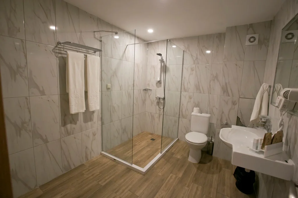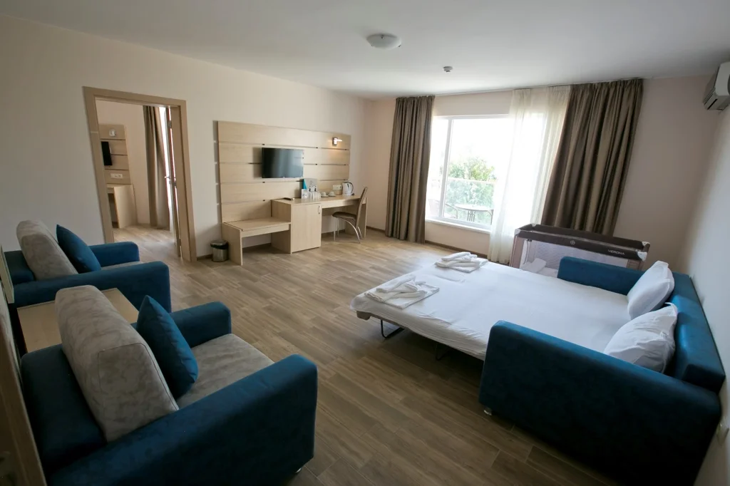 Apartament (Clădirea A) – 75 m², capacitate maximă 4 persoane. Configurație flexibilă: două dormitoare cu ușă comunicantă sau living și un dormitor cu ușă comunicantă. Dotări complete: televizor LCD prin satelit, minibar (contra cost), Wi-Fi gratuit, cutie de valori și balcon mobilat. Baia include duș, uscător de păr, papuci, prosoape și produse cosmetice. Pardoseala din teracotă sau parchet, curățenie zilnică și schimbarea lenjeriei de trei ori pe săptămână. Ideale pentru familii sau grupuri de prieteni care doresc mai mult spațiu și intimitate.