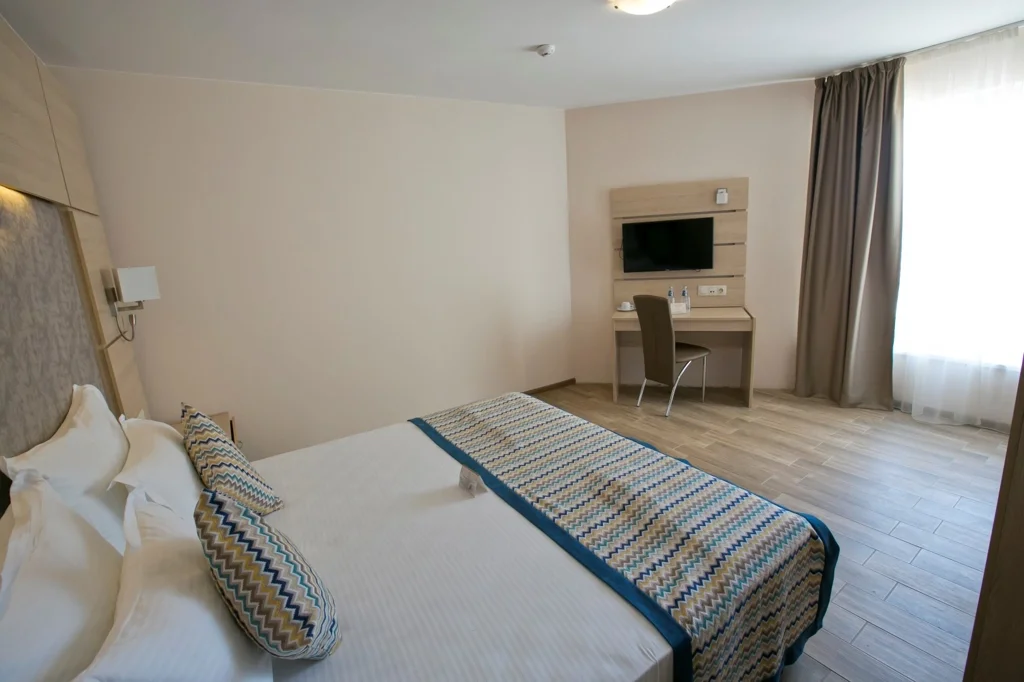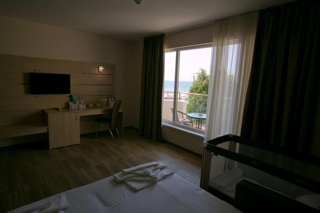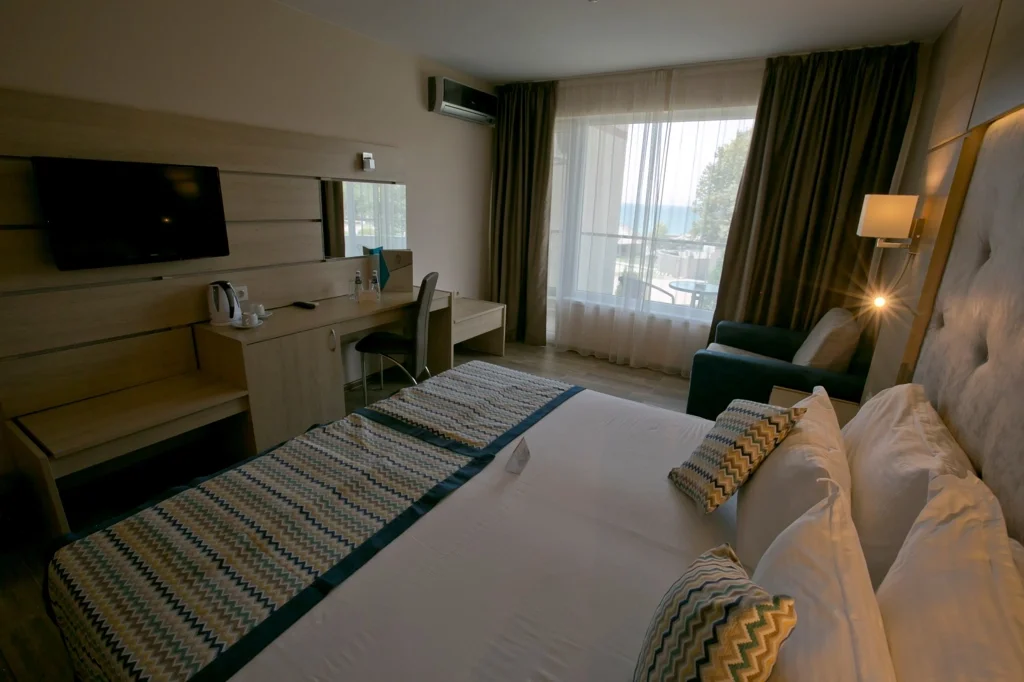 Camera Dublă cu Vedere Laterală la Mare sau la Parc (Clădirea B) – 26 m², capacitate maximă 2+1 sau 2+2 persoane. Dotări identice cu celelalte camere duble, cu avantajul unei capacități extinse, potrivită pentru familii mici sau grupuri. Vedere laterală spre mare sau spre parcul din incintă.