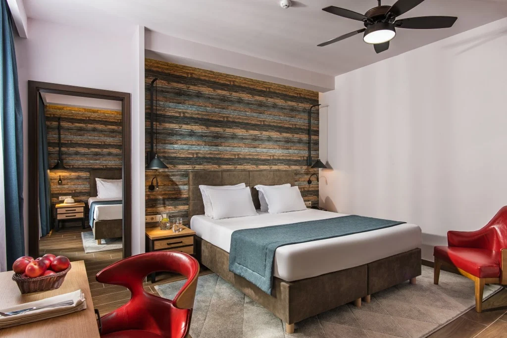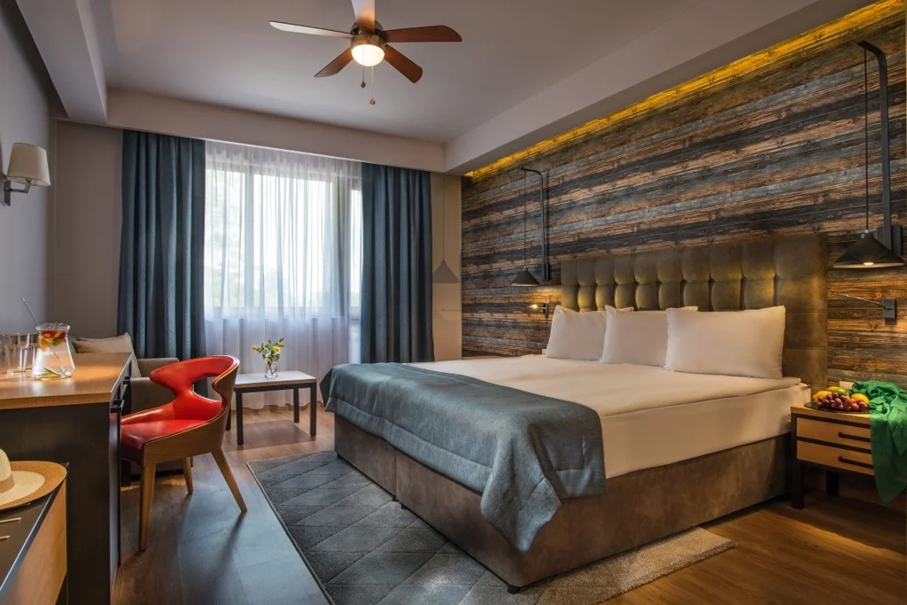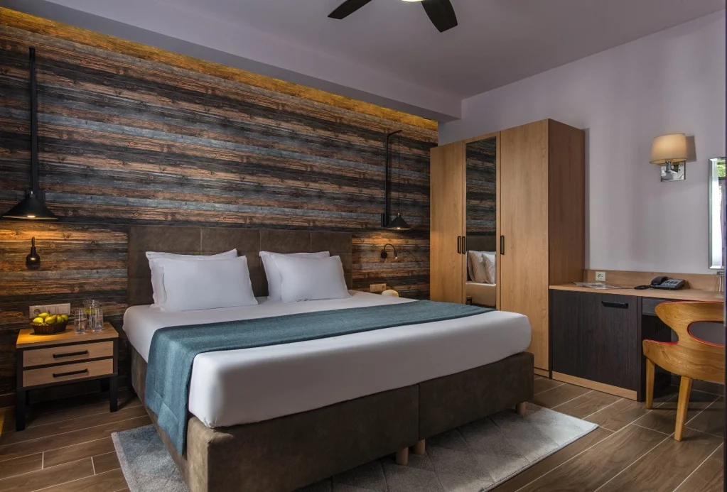 Camera Double Standard – 24-26 mp, capacitate maximă 2+2 persoane, disponibilă cu vedere la parc, vedere laterală la mare sau vedere directă la mare. Dotată cu 2 paturi separate sau 1 pat king-size, pat suplimentar (canapea extensibilă), balcon, aer condiționat, TV cu ecran plat, seif gratuit, minibar gratuit (apă, bere, băuturi răcoritoare, reaprovizionat zilnic), fierbător, baie cu duș, uscător de păr și produse cosmetice. Curățenie zilnică, schimbarea prosoapelor zilnic.