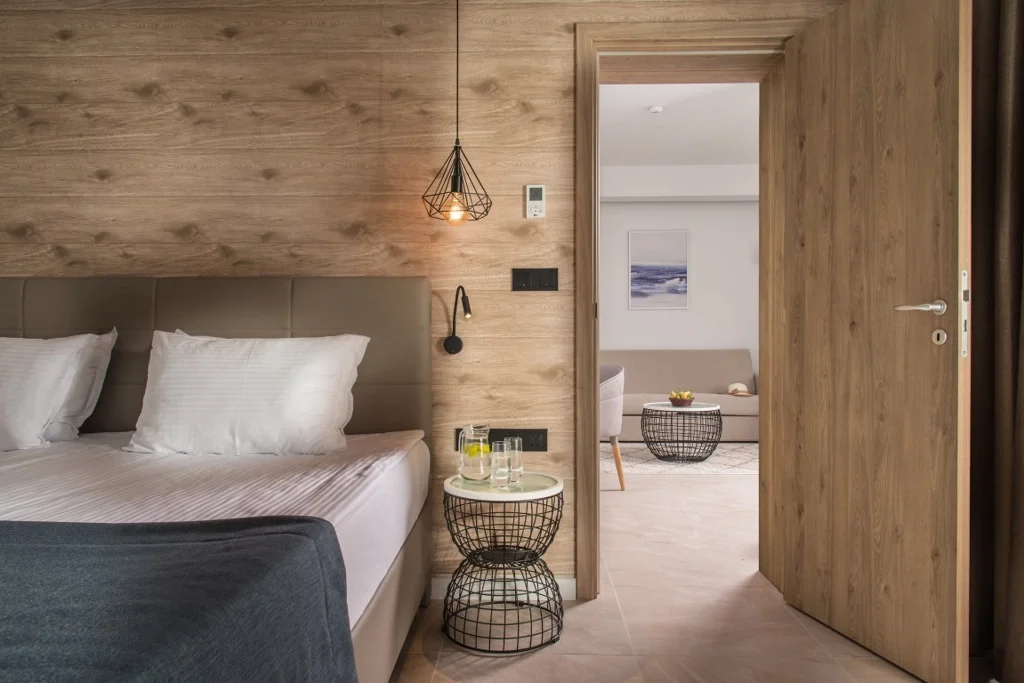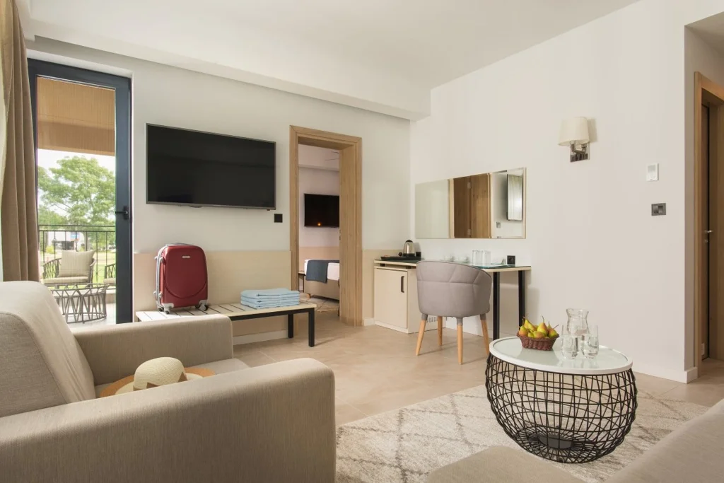 Apartament Royal – 45-55 mp, capacitate maximă până la 5 persoane, vedere la grădină. Configurat cu 2 dormitoare cu pat dublu fiecare și ușă de comunicare, plus canapea extensibilă în unul dintre dormitoare. Include espressor cu capsule gratuit, minibar extins specific Clubului Regal, 1 baie cu duș, balcon, aer condiționat și toate dotările standard.