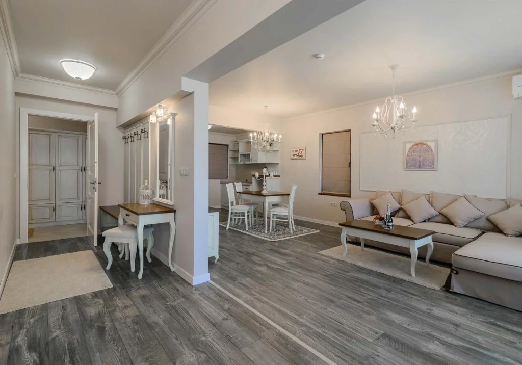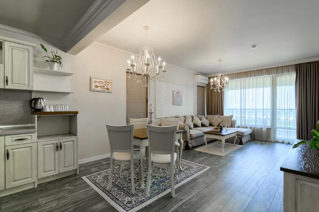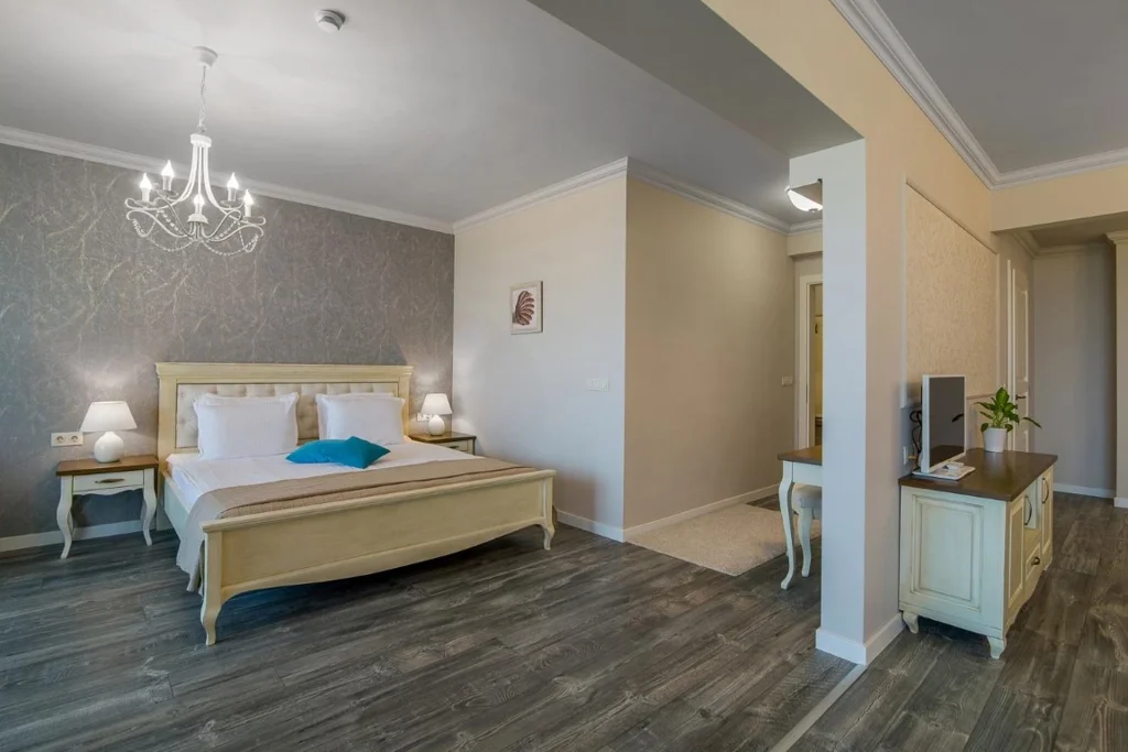 Apartament cu 1 Dormitor - 50 m², capacitate maximă 2+2 persoane (până la 4), configurat ca un spațiu amplu cu dormitor, living și chicinetă integrat, cu canapea extensibilă pentru persoane suplimentare. Dispune de balcon, televizor, telefon, fierbător electric, seif gratuit, minibar la cerere (contra cost), baie cu duș sau cadă, uscător de păr și produse cosmetice. WiFi gratuit inclus. Vedere la mare.