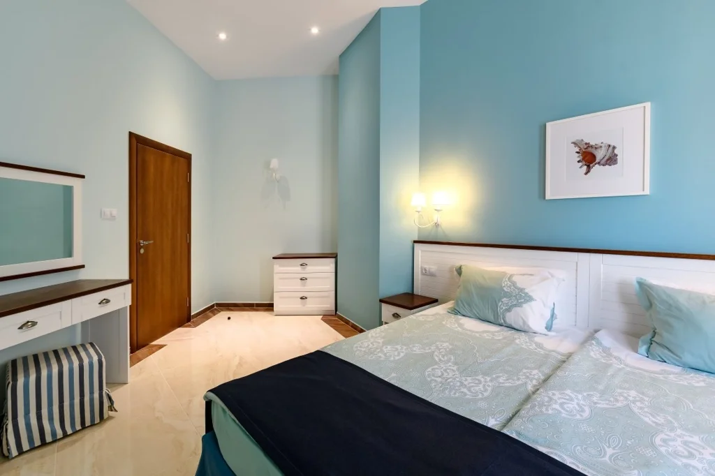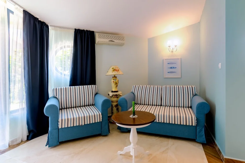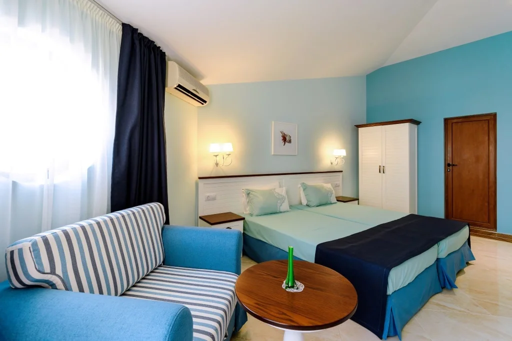 Apartament cu 1 Dormitor – 70 m², conceput pentru maximum 4 persoane și ideal pentru familiile care doresc mai mult spațiu și intimitate. Dispune de două paturi separate care pot fi unite, plus fotoliu extensibil și canapea extensibilă ca paturi suplimentare. Toate dotările standard sunt prezente: aer condiționat individual, televiziune prin satelit, minibar gol, seif contra cost, Wi-Fi gratuit, baie completă cu duș, uscător de păr și produse cosmetice, balcon mobilat și pardoseală din plăci ceramice. Renovările din 2021 aduc un plus de prospețime întregului fond de cazare.