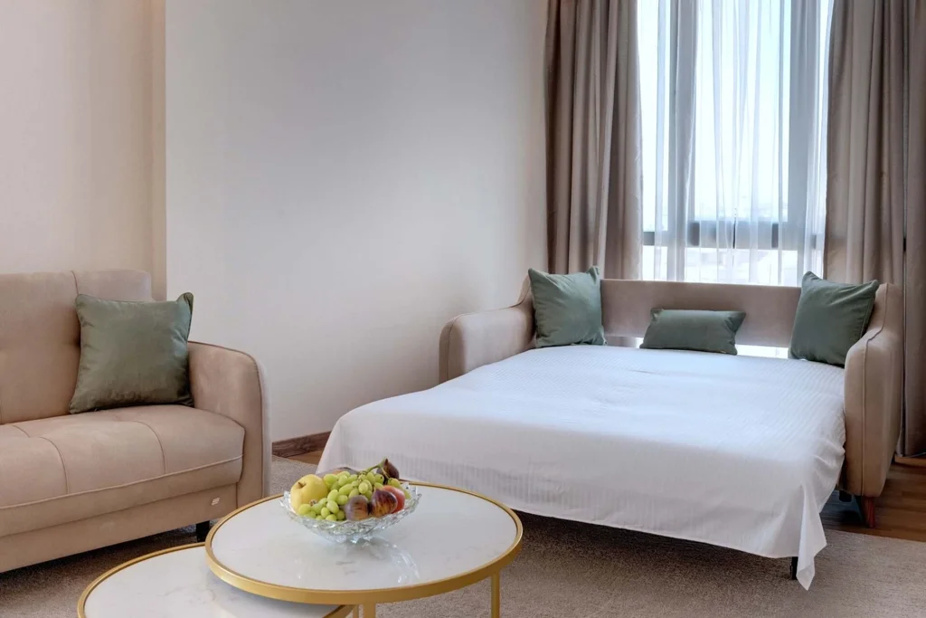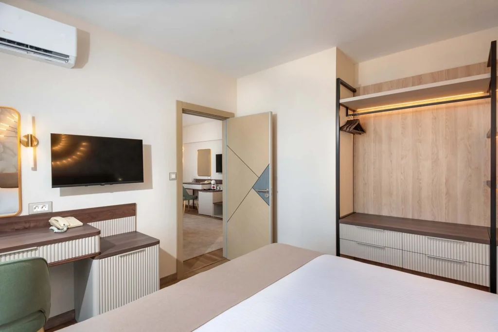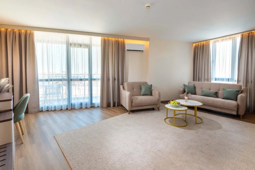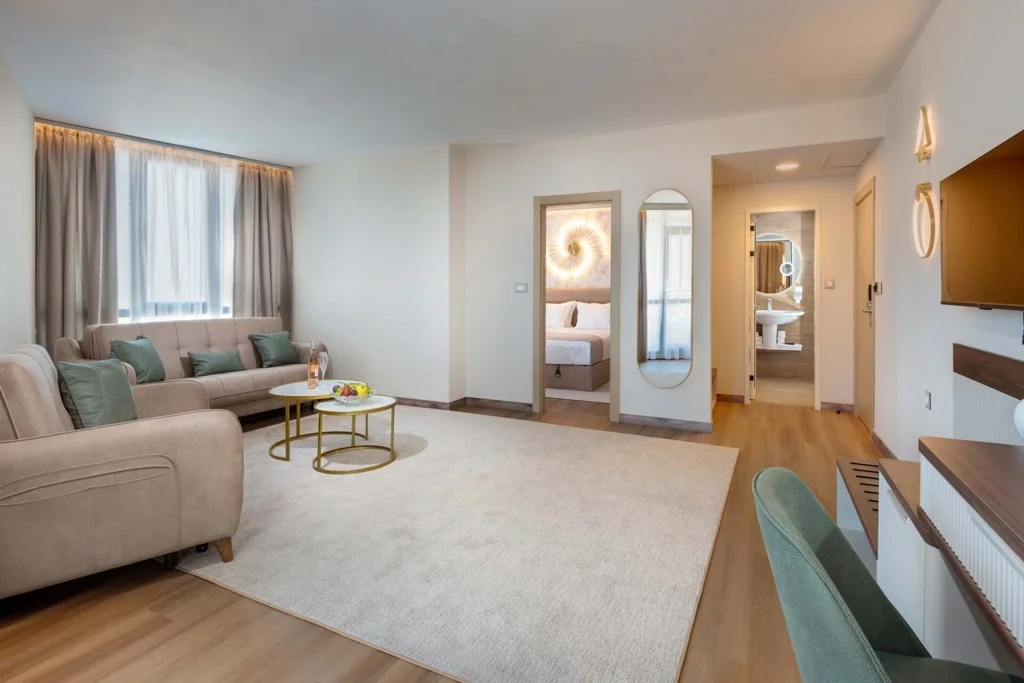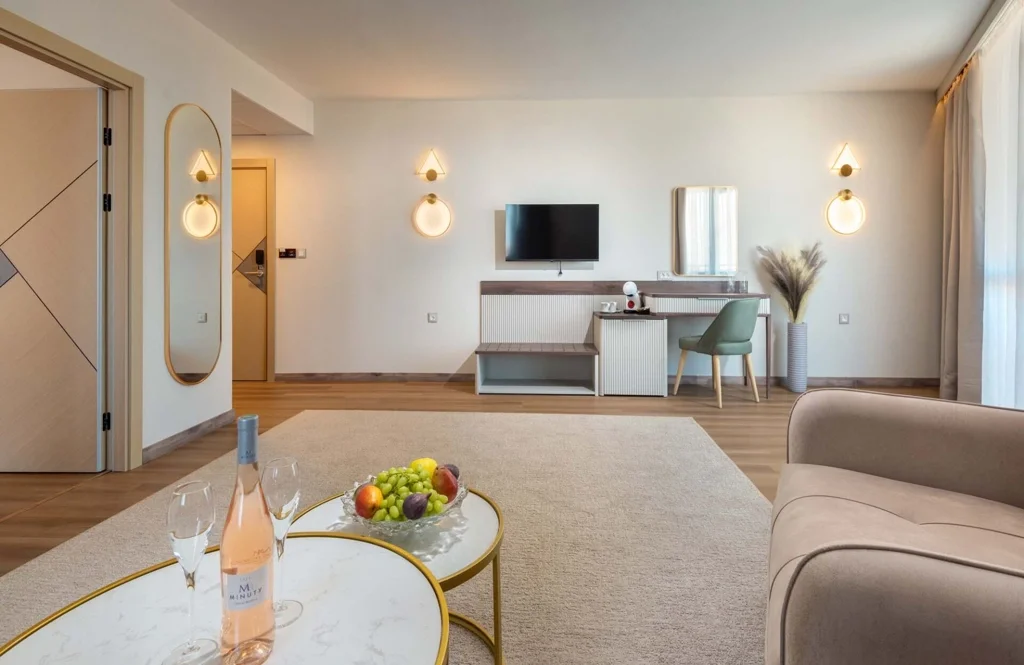 Apartament cu 1 Dormitor – cu o suprafață generoasă de 36 m², apartamentele sunt ideale pentru familii, putând găzdui până la 3-4 persoane. Dispun de un living și un dormitor separate printr-o ușă comunicantă, pat dublu, canapea sau fotoliu extensibil, aer condiționat individual, TV prin satelit, minibar, cafetieră, seif gratuit și balcon. Baia este dotată cu duș, prosoape și articole de toaletă complete.
