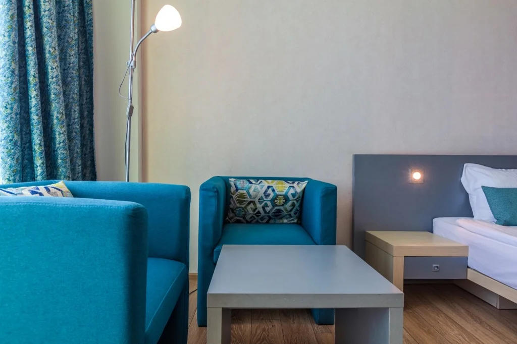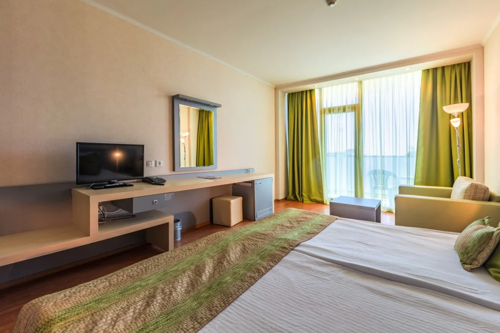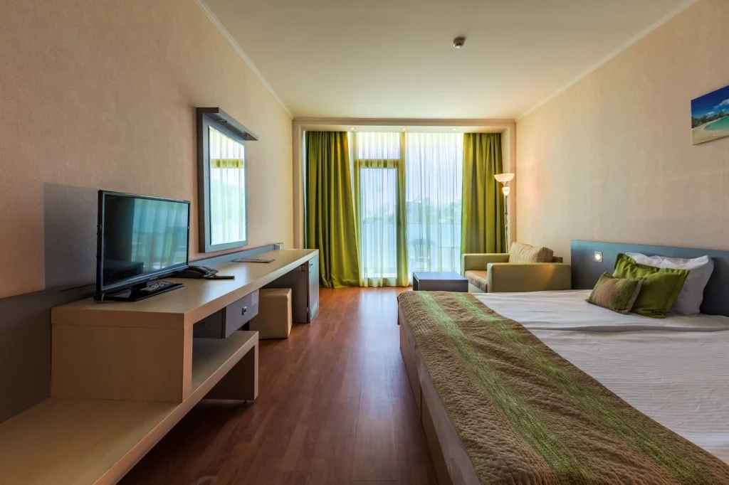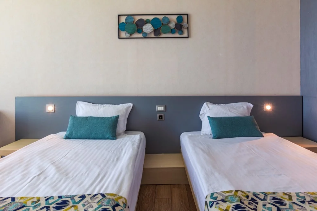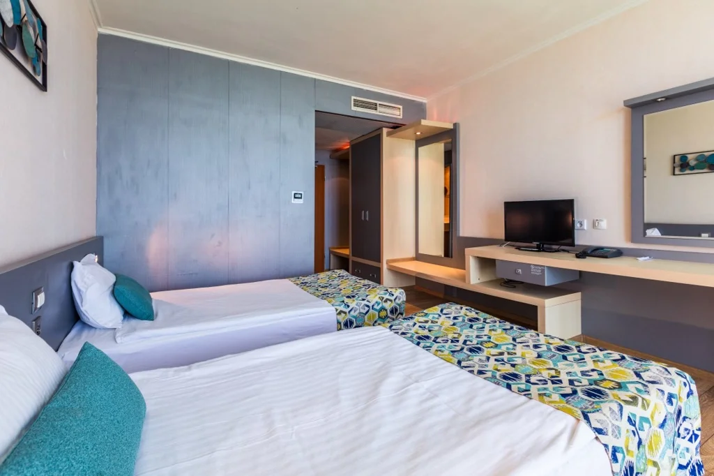 Deluxe Double Room – 28 m², capacitate maximă 2+1 persoane (până la 3 în total prin canapea extensibilă), cu vedere laterală la mare. Camera poate fi configurată cu două paturi separate sau pat dublu, plus pat suplimentar (canapea extensibilă). Dotările sunt identice cu categoria Premium: aer condiționat central, TV prin cablu, minibar cu conținut inițial gratuit, fierbător și aparat de cafea, cafea și ceai gratuite zilnic, telefon, seif gratuit, Wi-Fi gratuit, baie cu duș, uscător de păr, balcon mobilat și pardoseală laminată sau ceramică. De asemenea, beneficiază de renovarea integrală din 2026. Hotelul dispune și de 2 camere special amenajate pentru oaspeți cu dizabilități.