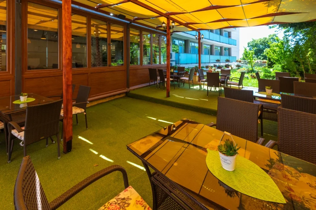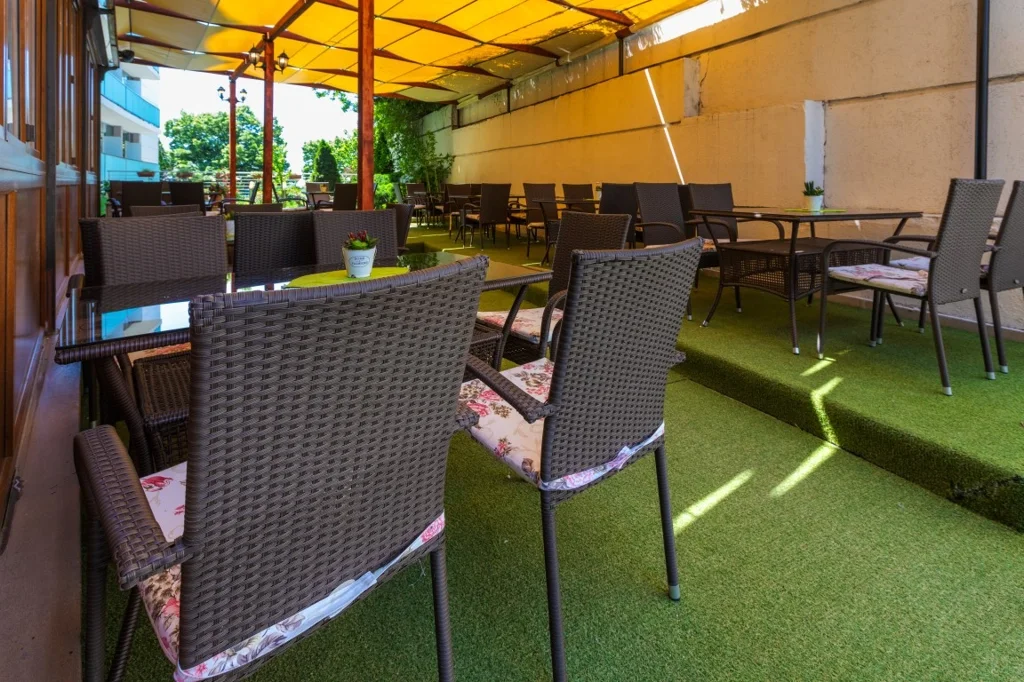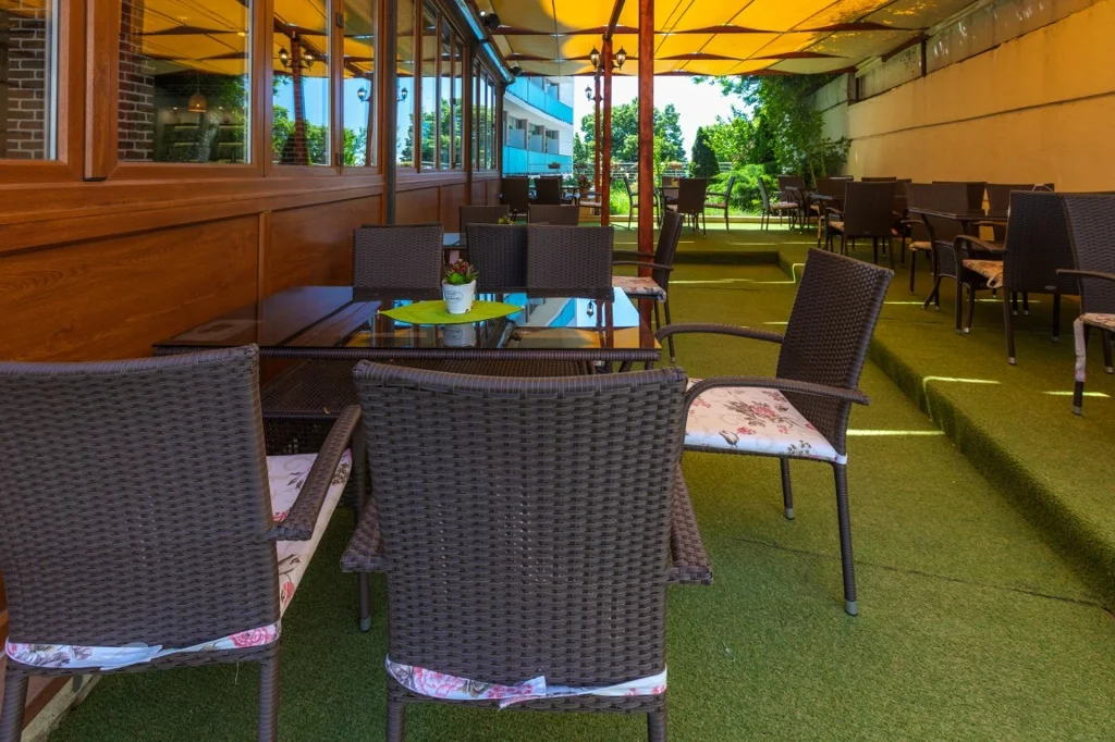 Sky Bar All Inclusive este deschis între 08:30-24:00 și oferă întreaga gamă de băuturi incluse în pachet, inclusiv sucuri proaspete și băuturi premium de import contra cost suplimentar. Stația de autoservire nocturnă (21:00-07:30) asigură continuitate cu apă, sucuri, băuturi calde, fructe, sandvișuri și gustări. Restaurantul gourmet à la carte Vista Del Mar, situat pe acoperiș, este disponibil în perioada 10 iunie – 15 septembrie și include o vizită gratuită pentru oaspeții cu minimum 5 nopți de cazare. Meniul rafinat cuprinde fructe de mare, carne și opțiuni vegetariene, servite cu priveliște panoramică spectaculoasă spre Nessebar și Sunny Beach, alături de muzică live în fiecare seară. Rezervarea este obligatorie, capacitatea fiind limitată.