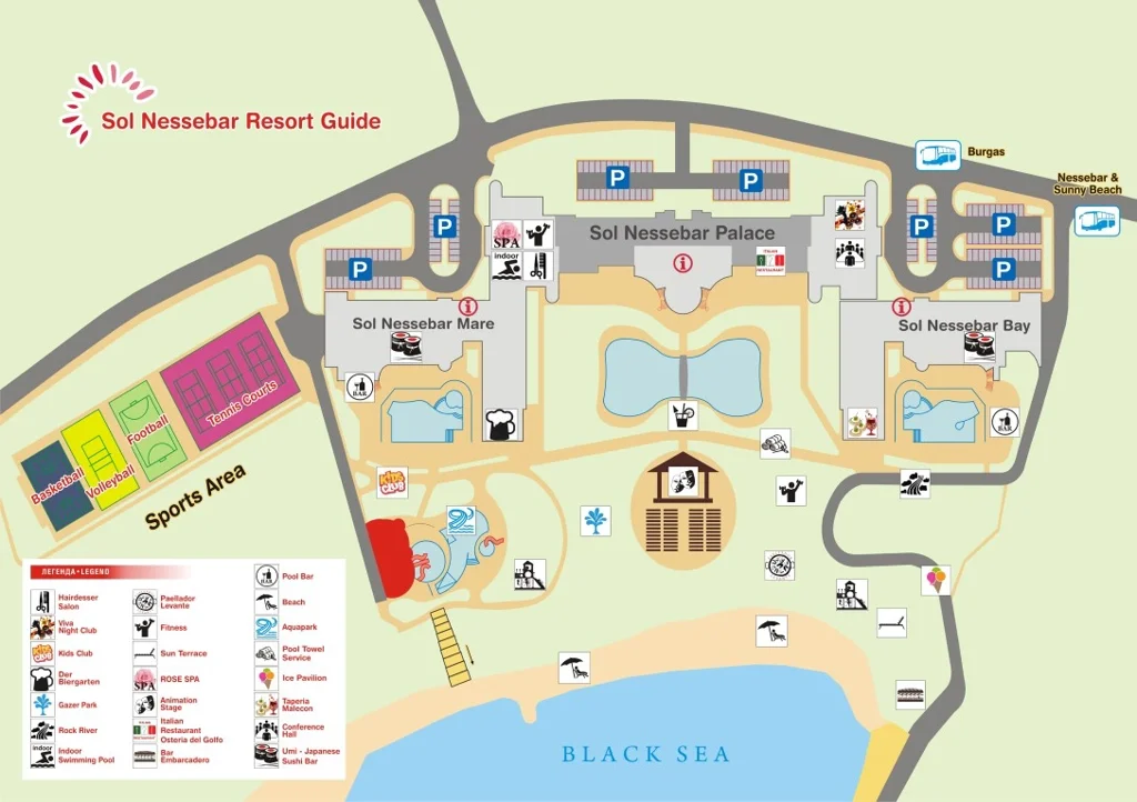 Sol Nessebar Mare se află în stațiunea Nessebar, pe coasta bulgărească a Mării Negre, în imediata apropiere a plajei publice cu nisip. Hotelul beneficiază de terase direct pe malul mării, oferind oaspeților acces facil la zona de plajă. Nessebar este un oraș cu o istorie milenară, inclus în patrimoniul UNESCO, oferind o combinație unică între turismul balnear și cel cultural. Aeroportul internațional Burgas se află la aproximativ 35 km distanță, iar transferul poate fi organizat la cerere. Centrul stațiunii moderne este accesibil și cu autobuzul de transfer al complexului, disponibil contra cost.