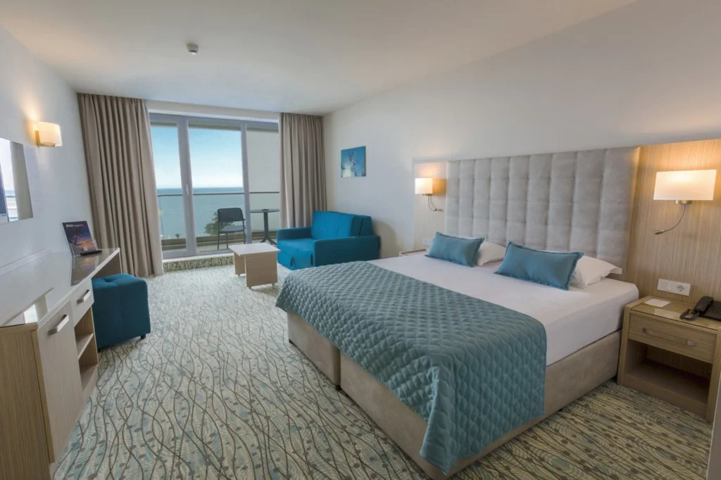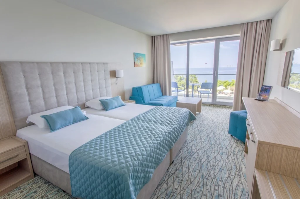 Camera Dublă Superioară – 35 m², capacitate maximă 2+2/3 persoane, cu vedere laterală la mare. Spațiu mai generos față de camerele standard, pat dublu și canapea extensibilă, Wi-Fi gratuit, televiziune prin cablu, minibar inclus și reumplut la fiecare 2 zile, fierbător electric, cafea și ceai gratuite (reumplute la fiecare 2 zile), balcon și baie cu cabină de duș.