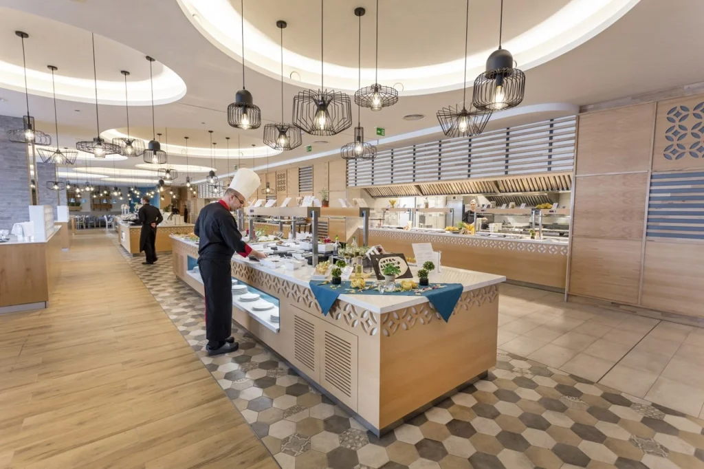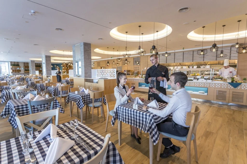 Sejurul la Astoria Hotel în regim All Inclusive acoperă toate mesele principale și gustările pe parcursul zilei. Micul dejun se servește la bufet între 07:30 și 10:00, cu stații de gătit deschis, iar pentru cei care se trezesc mai târziu este disponibil un mic dejun continental între 10:00 și 11:00. Prânzul este un bufet extins (12:30 – 14:00) cu salate, supe, colț vegetarian, preparate din carne și deserturi variate, iar gustări sunt disponibile în restaurant între 12:00 și 17:00. Magazinul de dulciuri CakeIt! oferă produse de patiserie proprie între 15:00 și 17:00, incluse în pachet. Cina se servește la bufet extins între 18:00 și 21:00, cu bufete tematice de 3 ori pe săptămână. Opțional, oaspeții pot lua cina la restaurantul italian sau asiatic (rezervare prealabilă necesară, număr de vizite limitat per sejur). Băuturile alcoolice și nealcoolice locale (spirtoase, vin la halbă, bere la halbă, cocktailuri, cafea, ceai) sunt incluse la baruri între 08:00 și 24:00. Barul de pe plajă servește băuturi all-inclusive între 10:00 și 17:00, în funcție de condițiile meteo. Bauturile internaționale nu sunt incluse în pachet. Cazarea începe cu prânzul și se încheie cu micul dejun.