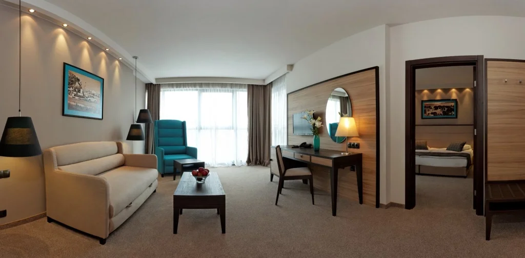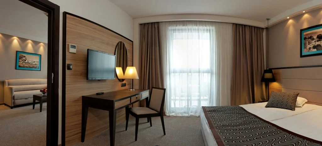 Camera Dublă Deluxe (LUX) – 27 m², cu aceleași dotări premium ca și camera standard, dar oferind un spațiu ușor mai generos și un nivel superior de confort. Potrivită pentru turiștii care doresc puțin mai mult rafinament în sejurul lor la Golden Sands, poate găzdui maximum 3 persoane.