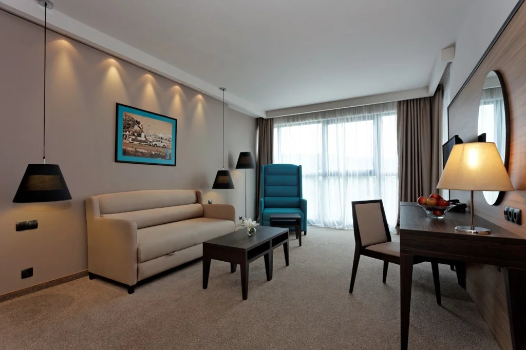 Apartamentul cu 1 Dormitor – 37 m², cea mai spațioasă opțiune de cazare din hotel, recomandată familiilor cu copii (capacitate max. 2 adulți + 2 copii sau 4 persoane). Dispune de toate dotările standard: aer condiționat central, TV prin cablu, minibar, Wi-Fi gratuit, baie cu cadă, uscător de păr, balcon mobilat și pat suplimentar.