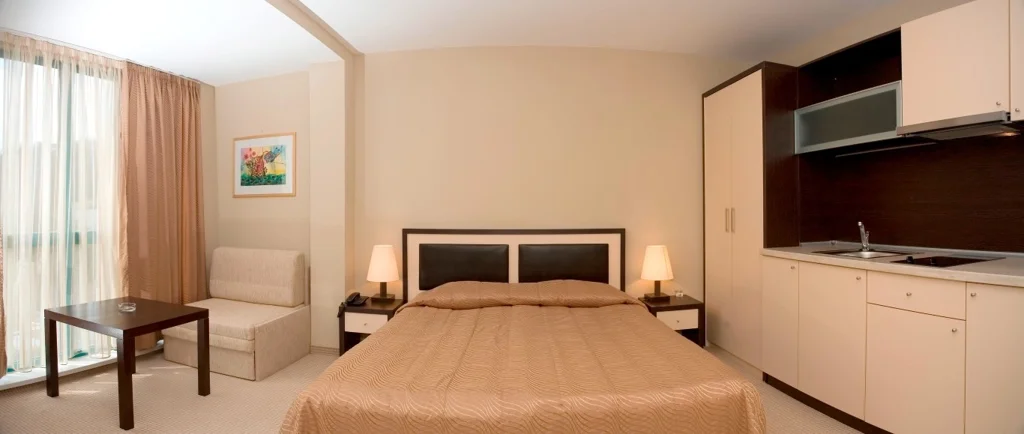 Apartament cu 1 Dormitor – apartament spațios de 40 m², cu living și dormitor separat, capacitate pentru maximum 4-5 persoane și până la 3 paturi suplimentare. Include balcon mobilat, cadă, duș, uscător de păr, articole de toaletă, seif gratuit și Wi-Fi gratuit. Ideal pentru familii cu mai mulți copii sau grupuri mici.