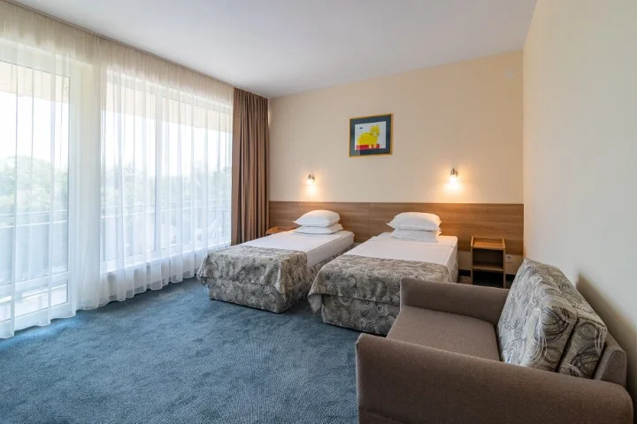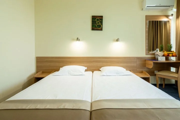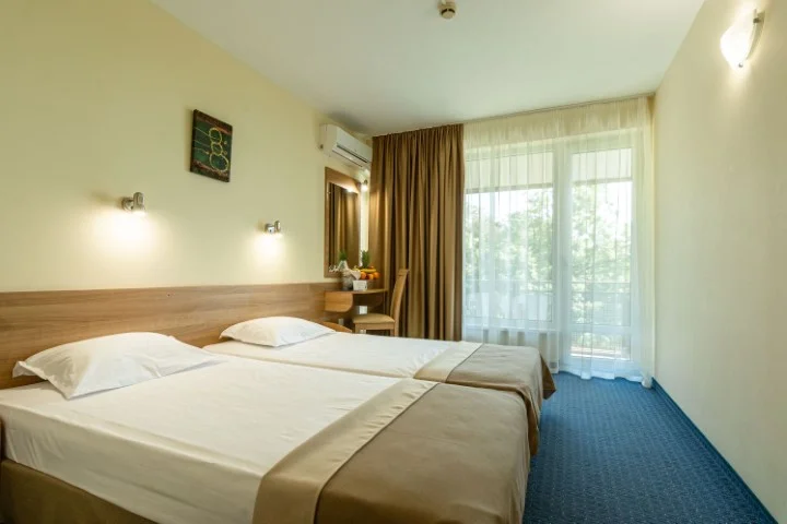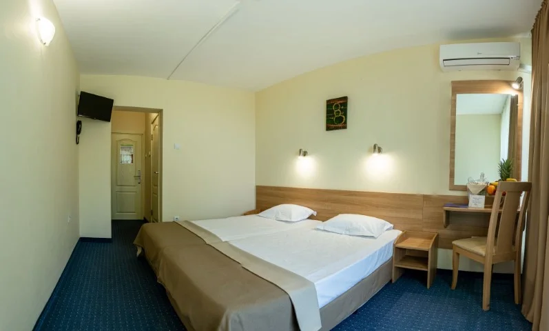 Camera Dublă Standard – 18 m², capacitate maximă 2+1 persoane, aceleași dotări ca și camera eco: aer condiționat individual, Wi-Fi gratuit, televizor cu ecran plat, telefon, frigider, balcon, baie cu duș, uscător de păr. Vedere spre parc și piscină. Seiful este disponibil la recepție contra cost.