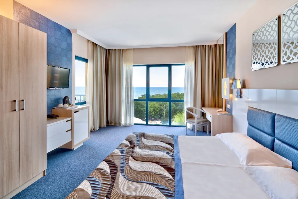 Camera Dublă Deluxe cu Vedere la Mare - suprafață cuprinsă între 26 și 30 m², ideală pentru 2 adulți cu posibilitatea unui pat suplimentar (max. 2+1 sau 2+2 persoane), cu vedere la mare sau vedere laterală la mare. Dotări: aer condiționat central, televiziune prin satelit, Wi-Fi gratuit, seif gratuit, minibar cu reaprovizionare zilnică (apă, băuturi răcoritoare, bere), facilități pentru prepararea ceaiului și cafelei, baie cu duș, uscător de păr, prosoape, papuci și halate de baie, produse cosmetice, balcon mobilat. Curățenia se efectuează zilnic, lenjeria se schimbă de două ori pe săptămână. Camerele beneficiază de meniu de perne și saltele superioare, la cerere.