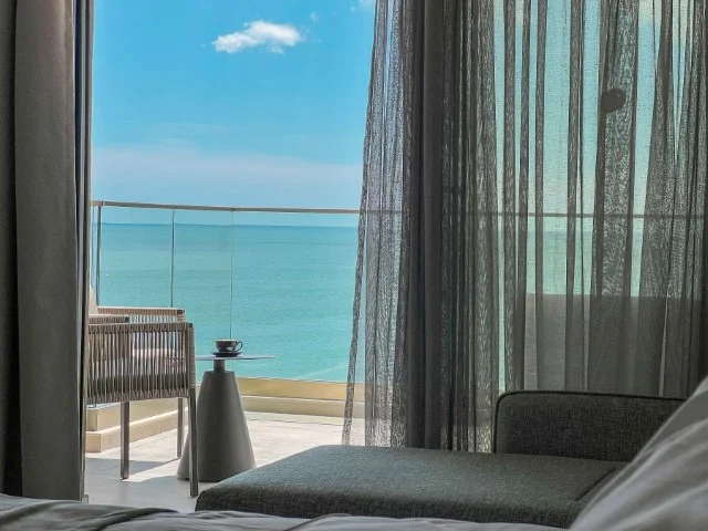 Suita Deluxe Swim-Up (16+) – Varianta premium cu piscină privată pe balcon, zonă separată de dormit și living. Aceleași beneficii exclusive ca la camera Swim-Up Dublă, plus spațiu suplimentar și articole Salvatore Ferragamo. Vedere frontală la mare.