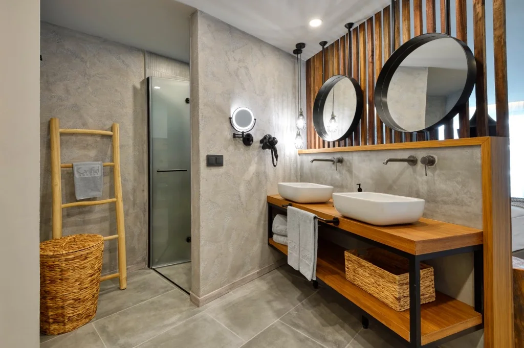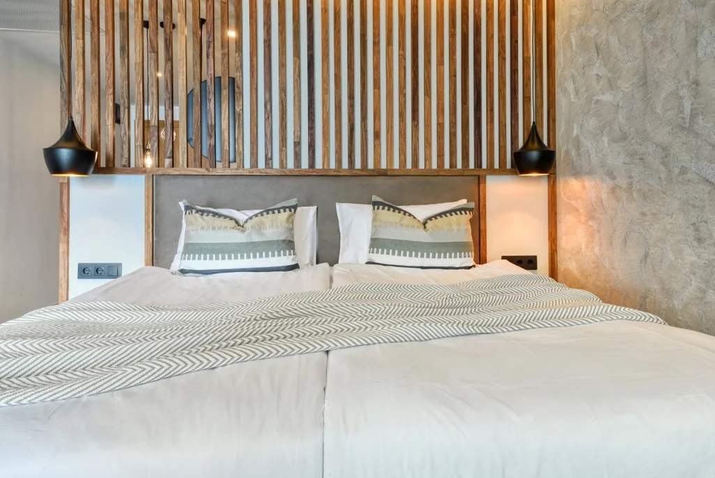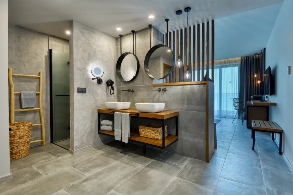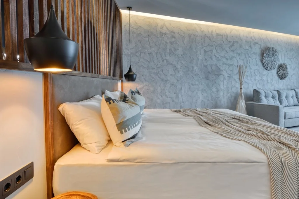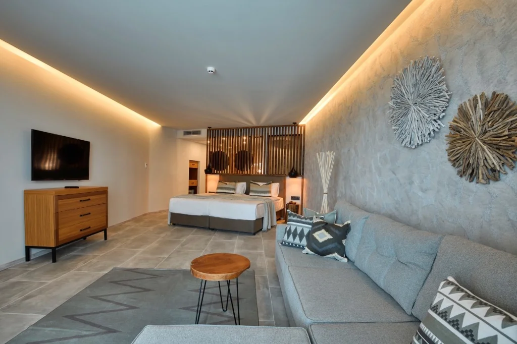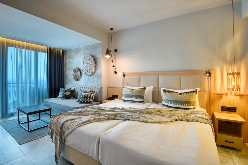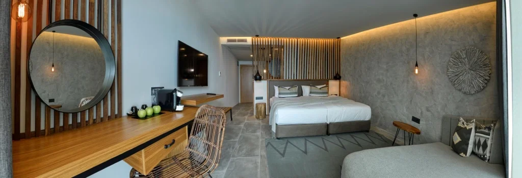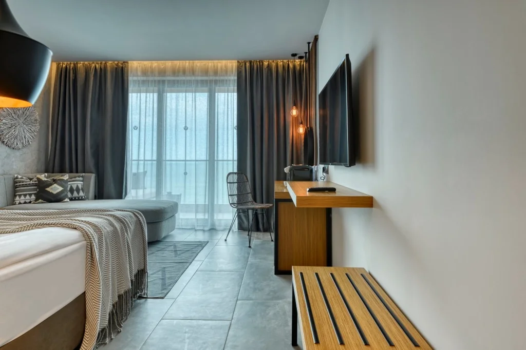 Camera Superioară Dublă cu Vedere Laterală la Mare – 36-40 m², pentru maximum 2+1 sau 3 persoane. Cameră generoasă tip open space, cu zonă de dormitor și zonă de relaxare distincte. Dispune de aceleași dotări ca și camera dublă standard, cu avantajul spațiului extins și al vederii laterale la mare de pe balconul mobilat.