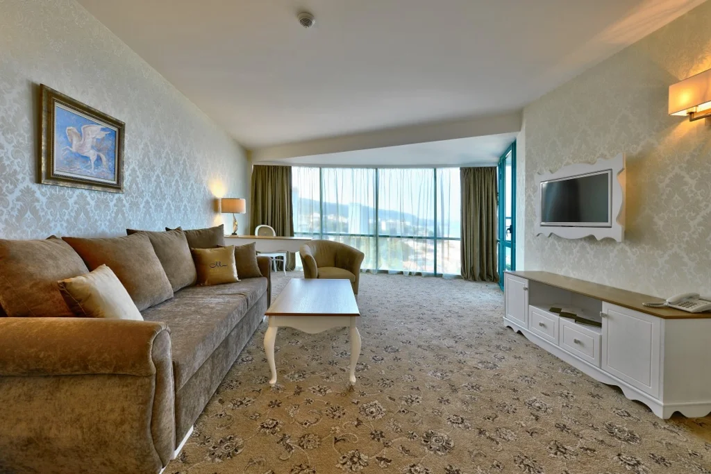 Apartament Deluxe cu 1 Dormitor – 52 m², capacitate maximă 2 adulți + 3 copii sau 3 adulți + 1 copil. Configurație similară apartamentului standard, cu două dormitoare cu ușă comunicantă, paturi twin sau pat dublu, canapea extensibilă, aer condiționat central, TV prin cablu, minibar, telefon, seif gratuit și Wi-Fi gratuit. Baia cu duș sau cadă, produse cosmetice, prosoape și uscător de păr, plus balconul și finisajele de calitate fac din această variantă alegerea ideală pentru familii mai pretențioase. Hotelul dispune și de 2 camere special amenajate pentru persoane cu dizabilități.