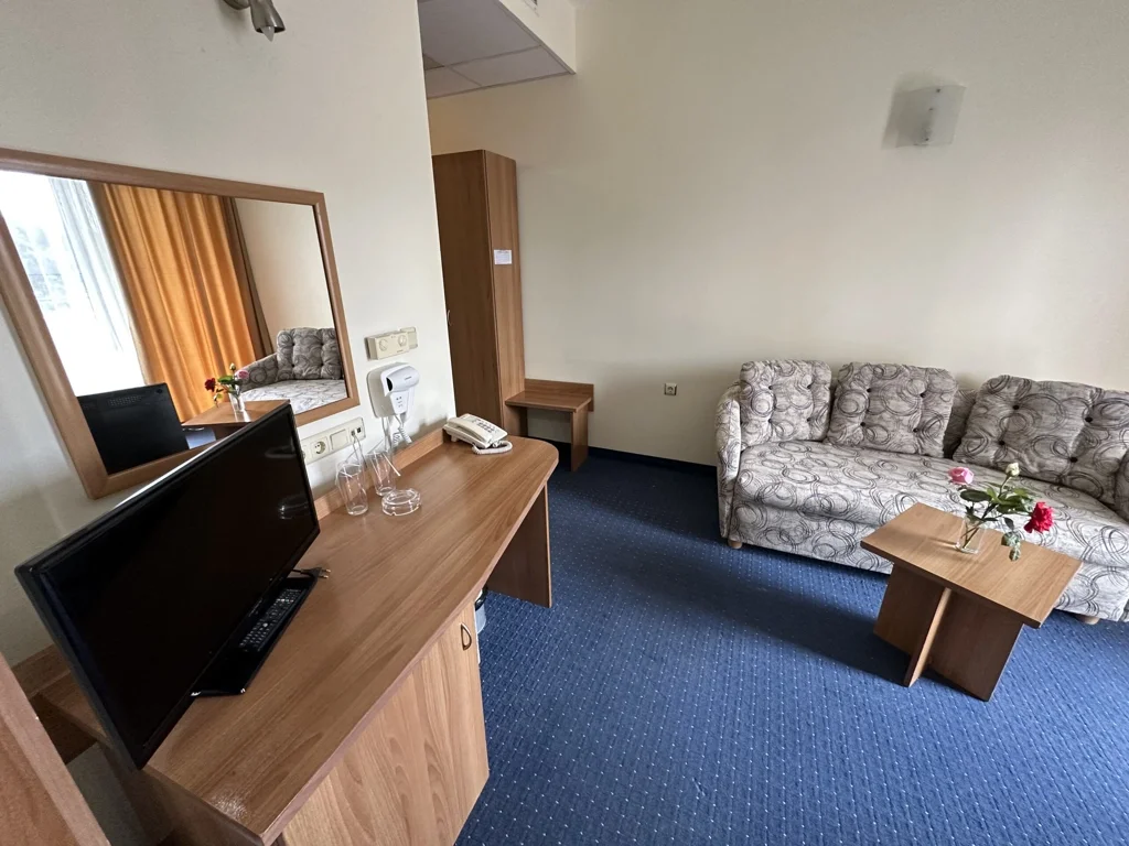 1-Bedroom Apartment – cu o suprafață generoasă de 32 m², apartamentul cu un dormitor poate găzdui până la 4 persoane și reprezintă alegerea perfectă pentru familii. Dispune de un dormitor separat, canapea extensibilă ca pat suplimentar, două paturi separate, aer condiționat central, telefon, minibar gol și Wi-Fi gratuit. Balconul mobilat oferă un spațiu de relaxare suplimentar, iar baia include duș, uscător de păr, prosoape și articole de toaletă. Podeaua este acoperită cu covor, conferind un plus de confort și căldură. Și apartamentele au fost modernizate în cadrul renovării din 2025.