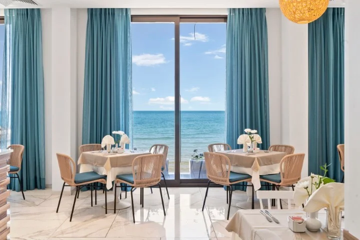 Apartament (Suite cu 1 dormitor) – 46 m², capacitate maximă 3 persoane. Spațiu generos compus dintr-un living și un dormitor cu ușă comunicantă, plus pat suplimentar (canapea extensibilă). Dotările sunt identice cu cele ale camerelor duble – aer condiționat, TV prin satelit, Wi-Fi gratuit, seif, aparat de cafea, minibar zilnic gratuit, baie cu duș, produse cosmetice de lux, halate la cerere. Vedere la mare. Ideal pentru oaspeții care doresc mai mult spațiu și confort sporit pe durata vacanței.