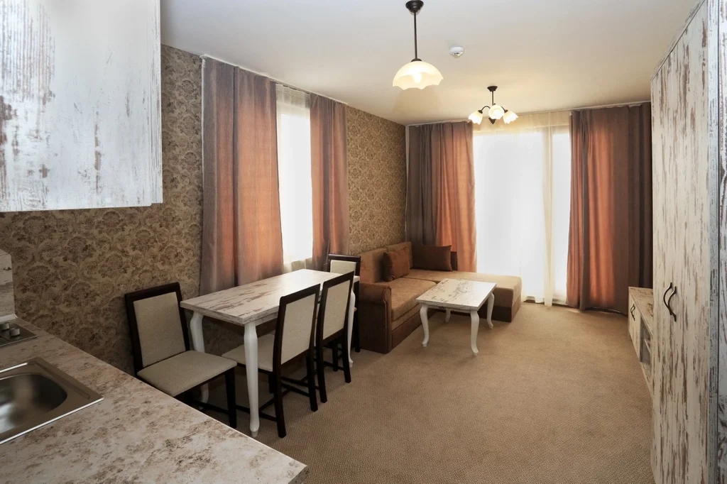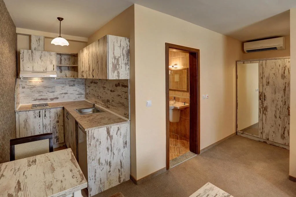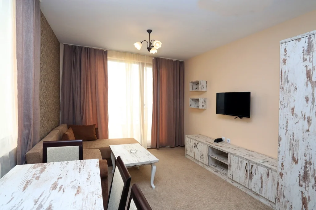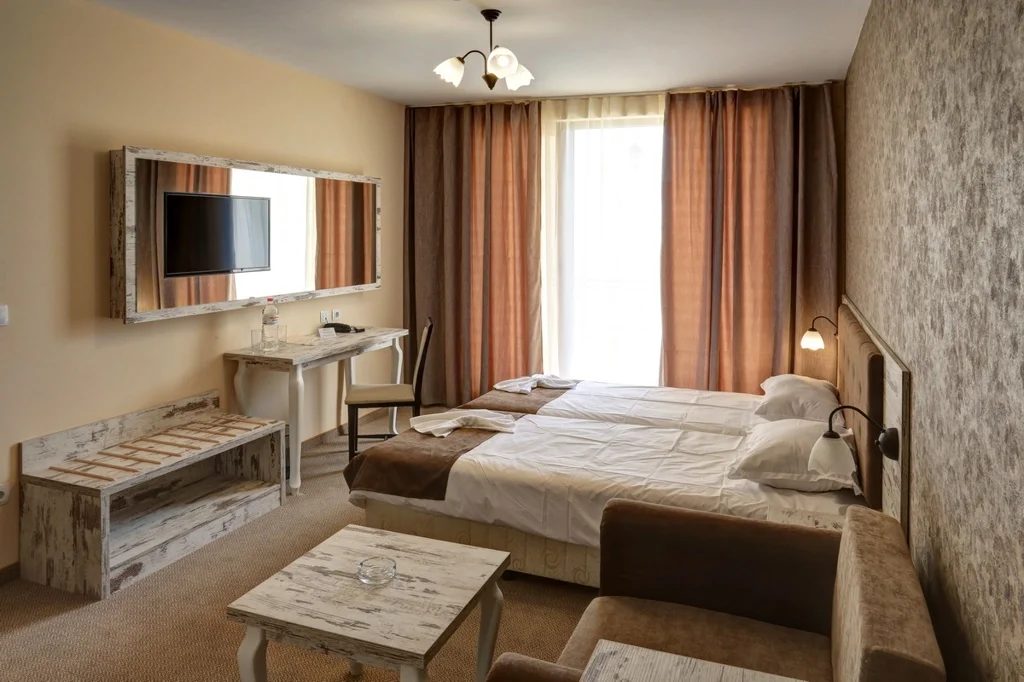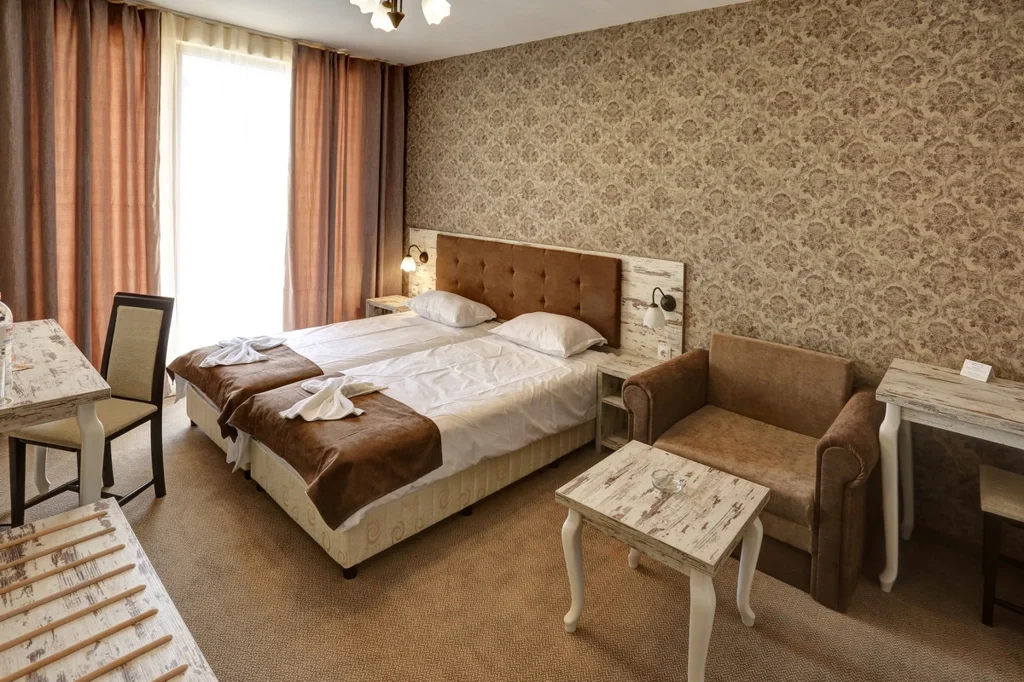 Apartament cu 1 dormitor - spațiu generos de aproximativ 30 m², cu capacitate pentru maximum 2+2/3+1 persoane, ideal pentru familii. Dispune de un living și un dormitor cu pat queen-size, plus o canapea extensibilă în living. Dotările includ aer condiționat individual, televiziune prin cablu, mini-frigider, telefon, seif (contra cost) și Wi-Fi gratuit. Baia are duș sau cabină de duș, uscător de păr și prosoape. Apartamentul are balcon și vedere la parc sau la mare. Condițiile de curățenie și schimbare a lenjeriei sunt identice cu cele de la camera dublă.