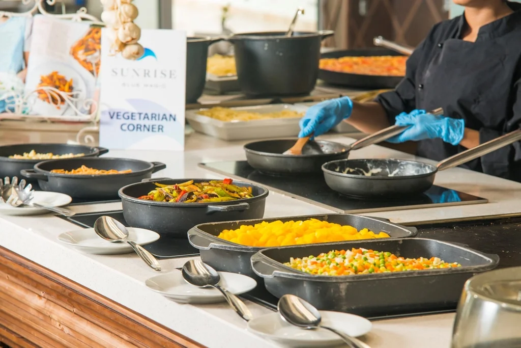 Pachetul all inclusive de la Sunrise Blue Magic Resort este unul dintre cele mai generoase de pe litoral, cu un program de masă detaliat și ore extinse de servire. Micul dejun se servește între 07:30 și 10:00 în restaurantul principal, sub formă de bufet bogat cu stație de gătit deschis; între 10:00 și 11:00 este disponibil un mic dejun târziu. Prânzul se servește între 12:30 și 14:30 în restaurantul principal (bufet internațional cu bar de salate, paste, pizza, stație de supe și deserturi), iar în sezon (1 iunie – 31 august) și la Snack Bar între 12:30 și 16:00. Cina se servește în restaurantul principal între 18:00 și 21:00, în stil bufet cu bucătărie internațională. De două ori pe săptămână au loc seri tematice culinare, iar oaspeții cu sejur de minimum 7 nopți beneficiază și de o cină à la carte gratuită. O gustare de noapte este disponibilă la barul din hol între 22:00 și 24:00.