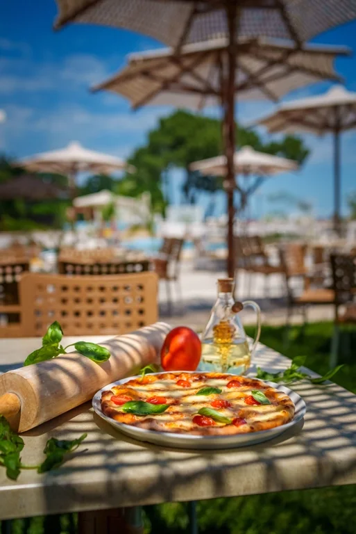 Conceptul Ultra All Inclusive de la HVD Riviera Beach este unul dintre cele mai generoase din regiune. Restaurantul principal tip bufet servește micul dejun între 7:30-10:00, prânzul între 12:30-14:00 și cina între 18:30-21:00, cu băuturi incluse la mese. Barurile din hol funcționează între 8:00 și 1:00 noaptea, oferind cafea Lavazza de specialitate și produse de patiserie de casă între 8:00 și 23:00. Snack bar-ul Riviera este deschis între 11:00-16:30 și oferă gogoși, înghețată, hamburgeri și hot dog. Gustările și sandvișurile de la miezul nopții sunt disponibile la barul din hol între 21:00 și 1:00. Barul de la piscină funcționează din mai până în septembrie (10:00-17:00), cu program extins în perioada iunie-august (10:00-19:00), iar barul de pe plajă completează oferta. Băuturile locale și internaționale îmbuteliate, atât alcoolice cât și nealcoolice, sunt incluse în pachet, alături de răcoritoare și cocktailuri. Restaurantul italian à la carte (program 18:00-22:00) poate fi rezervat gratuit o dată pe sejur pentru oaspeții cu minimum 5 nopți cazare. Săptămânal are loc o cină festivă, completată de seri tematice cu specific asiatic, mediteranean, italian și balcanic. Meniurile pentru bebeluși includ piureuri, biscuiți, fructe, budincă și lapte praf.