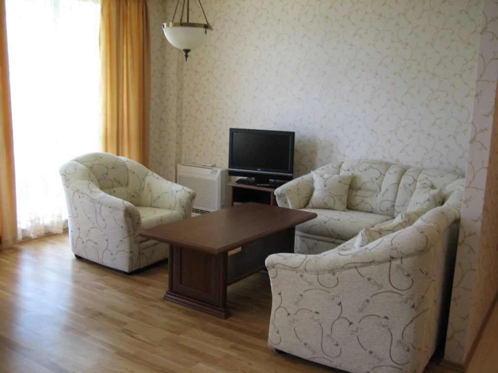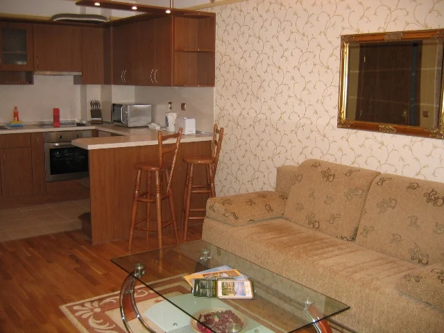 Apartament cu 1 dormitor – Suprafață de aproximativ 70 m², ideal pentru 2+2 sau 3+1 persoane. Fiecare apartament dispune de un living și un dormitor cu ușă comunicantă, pat dublu, aer condiționat tip split, televizor cu ecran plat și canale prin satelit. Balconul este disponibil la anumite unități. Bucătăria este complet utilată și permite gătitul: aparat de cafea, fierbător, cuptor cu microunde, prăjitor de pâine și minibar gol. Baia include cadă, duș, prosoape și produse cosmetice, iar uscătorul de păr poate fi solicitat la recepție. Wi-Fi este disponibil, iar curățenia se efectuează de două ori pe săptămână. Pardoseala este din gresie ceramică sau laminat.