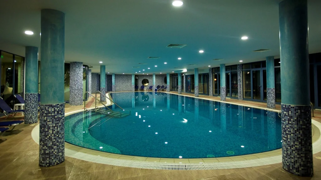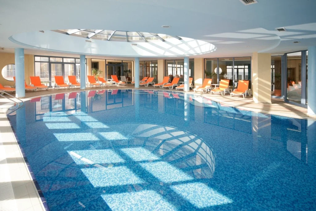 Complexul dispune de 3 piscine exterioare cu suprafețe de 272 m², 225 m² și 156 m², precum și o piscină interioară cu apă minerală și jacuzzi – ideală pentru zilele cu vreme mai puțin favorabilă. Șezlongurile și umbrelele sunt gratuite atât la piscine, cât și pe plajă (1 umbrelă și 2 șezlonguri per cameră, inclusiv prosoape de plajă). Zona de wellness include saună, baie de aburi și o cameră de relaxare, toate gratuite, la care se adaugă masaj, spa medical și salon de înfrumusețare contra cost. Wi-Fi-ul gratuit este disponibil în holul hotelului, iar room service-ul asigură comoditatea în cameră. Parcarea este disponibilă contra cost, iar seiful se poate închiria la recepție. Hotelul este dotat cu 2 lifturi și este adaptat pentru persoane cu dizabilități.
