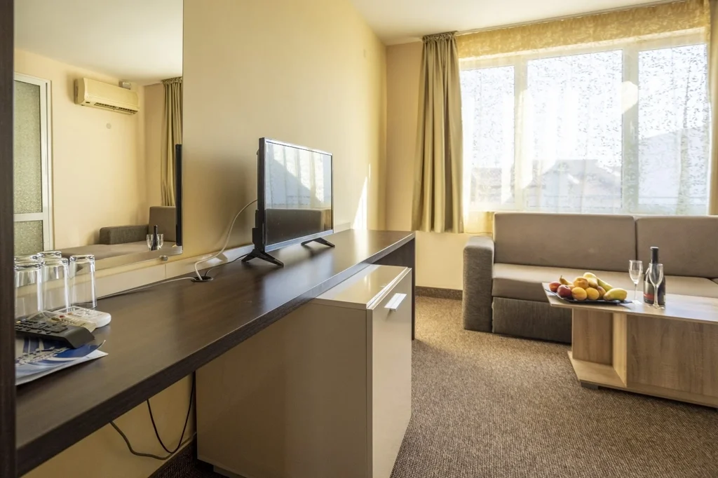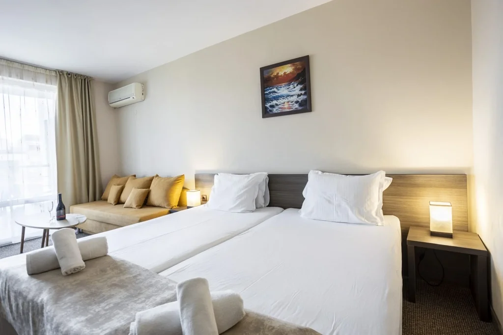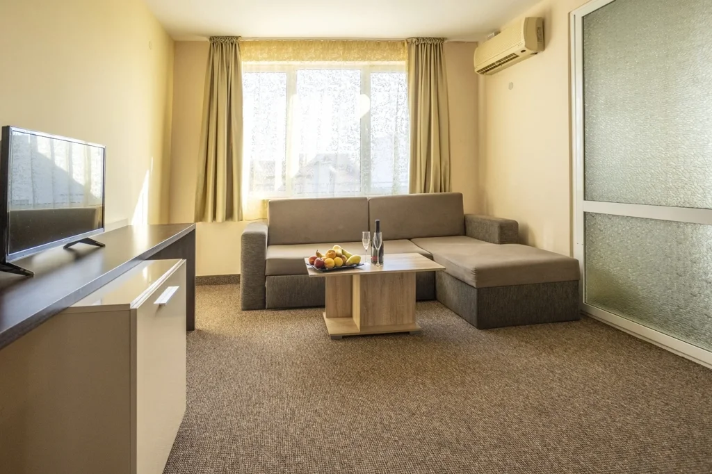 Apartament cu 1 Dormitor – 35-40 m², capacitate maximă 2+2/3 persoane, compus dintr-un living cu canapea extensibilă și un dormitor separat cu pat king size, cu ușă comunicantă între camere. Dotări complete: aer condiționat individual, televiziune prin cablu/satelit, mini-frigider, fierbător electric, telefon, baie cu duș, uscător de păr, produse cosmetice și balcon mobilat. Renovat în 2023, oferă un confort superior.