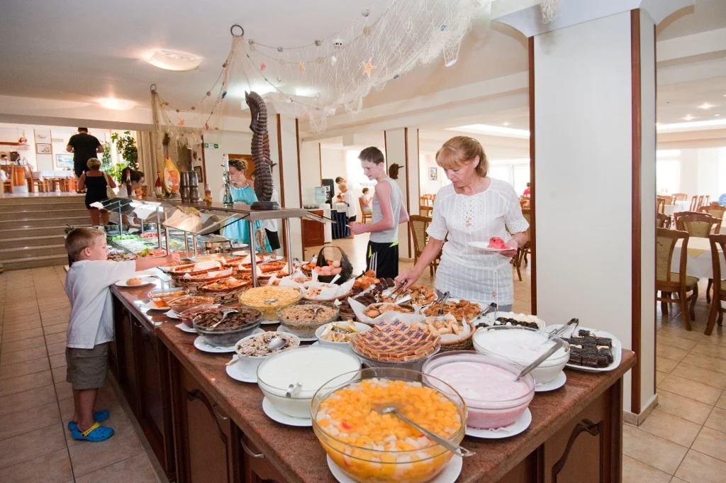 Villa List funcționează în regim All Inclusive Luminos, cu un program de masă bine structurat. Micul dejun se servește la restaurantul principal între orele 7:30-10:30 sub formă de bufet variat, cu posibilitatea unui mic dejun continental târziu între 10:30-11:30. Prânzul este disponibil de la 12:30 la 15:00 și include supe, bufet și deserturi diverse. Între orele 15:00-17:00 este disponibil un bufet de după-amiază cu sandvișuri, dulciuri și înghețată. Cina se servește la restaurantul principal între 18:30-21:30, tot în sistem bufet. Băuturile alcoolice și nealcoolice locale sunt incluse în pachet, servite atât în restaurante, cât și la barul din hol (10:00-24:00) și la barul de la piscină (10:00-18:30). Cocktailurile locale sunt de asemenea incluse. Bauturile internaționale nu sunt incluse și se achită separat. Planul All Inclusive începe cu prânzul în ziua sosirii și se încheie cu micul dejun în ziua plecării.