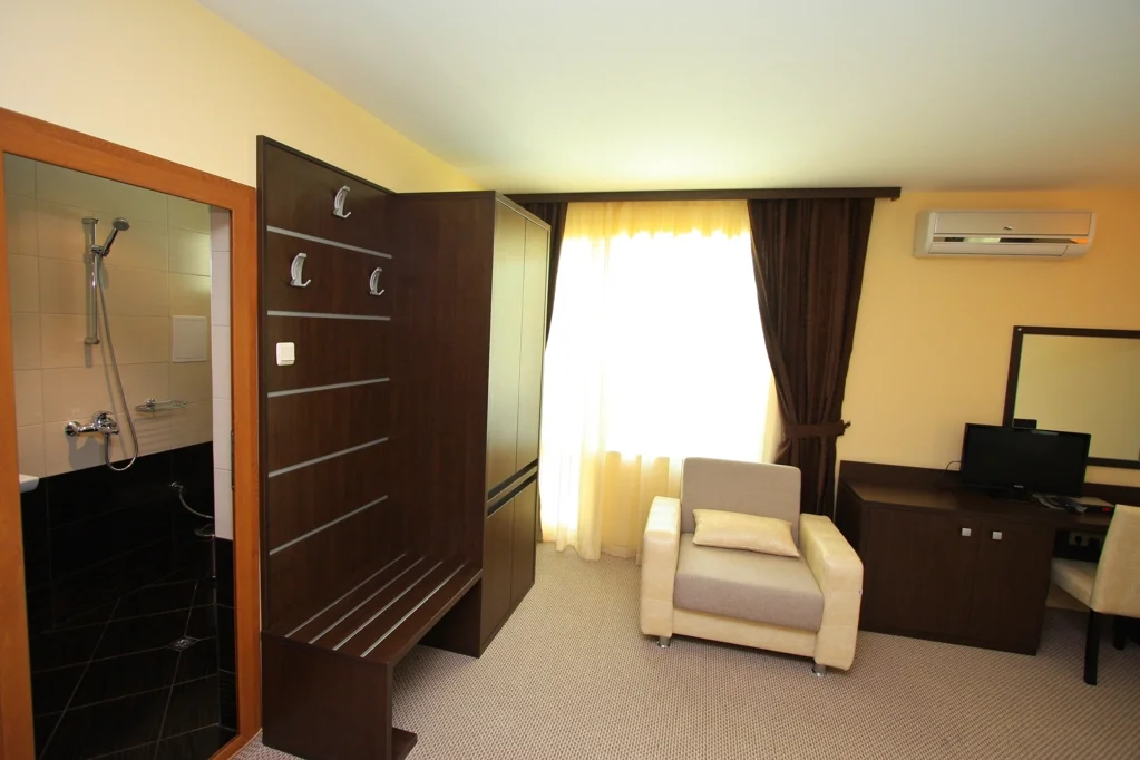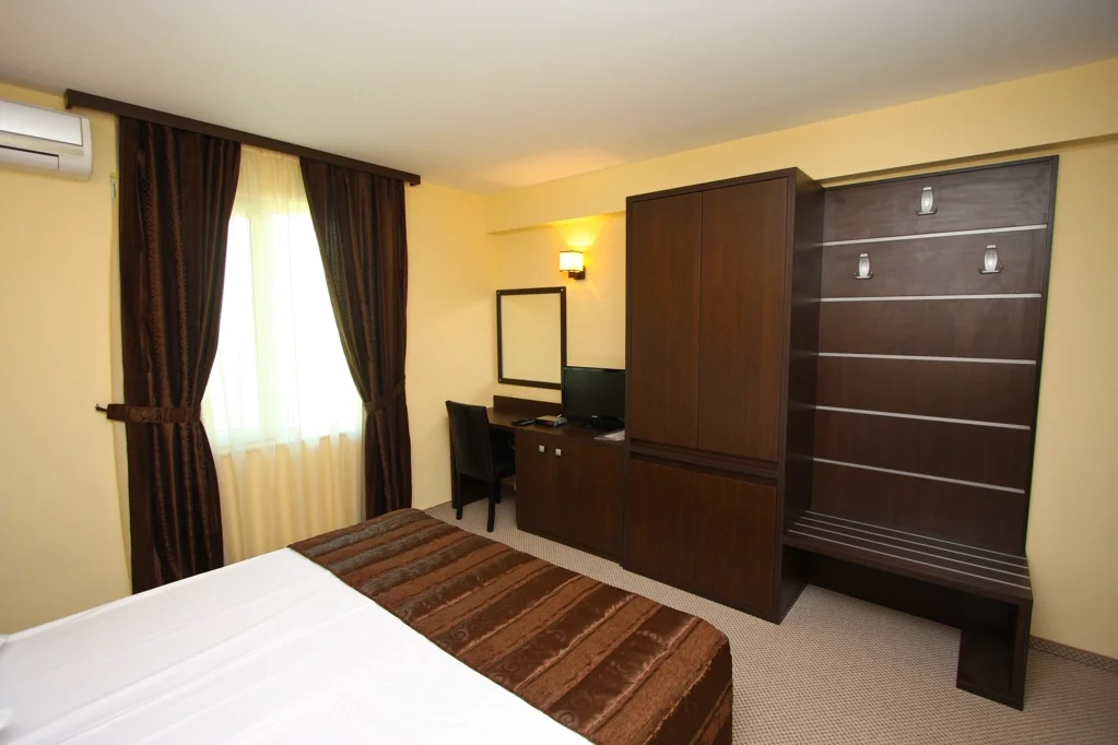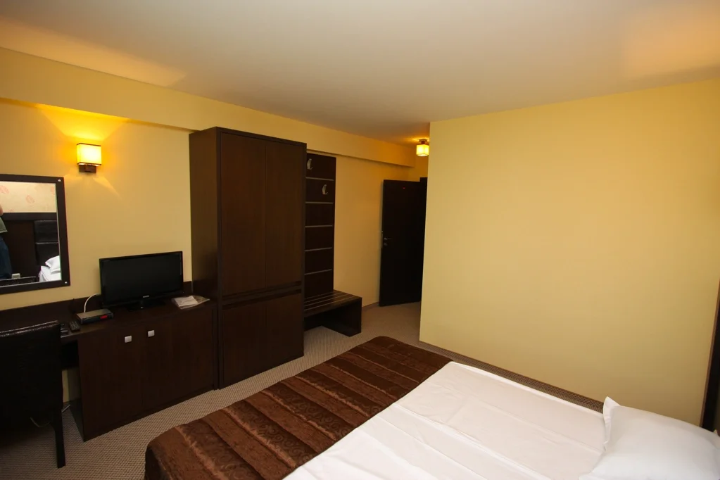 Camera Dublă Standard fără Balcon – suprafață de 16 m², destinată unui număr maxim de 2 persoane, cu aceleași dotări ca și varianta cu balcon: pat king-size, aer condiționat individual, televiziune prin cablu, radio, Wi-Fi gratuit, baie cu duș cu produse cosmetice, vedere la parc sau la oraș. O alegere potrivită pentru cupluri care prioritizează prețul față de spațiul exterior al camerei.