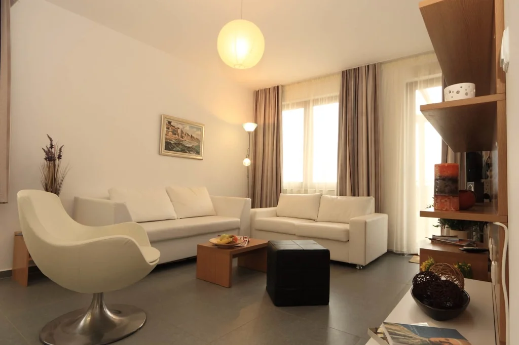 Apartament cu 1 dormitor – aproximativ 60 mp, capacitate maximă 2+2 persoane, cu living și dormitor separate printr-o ușă comunicantă, pat dublu și pat suplimentar disponibil. Dotări similare studioului: aer condiționat, TV prin satelit, Wi-Fi gratuit, chicineta complet echipată cu mașină de spălat, baie cu duș și balcon. Pardoseala îmbină gresia ceramică cu mocheta.