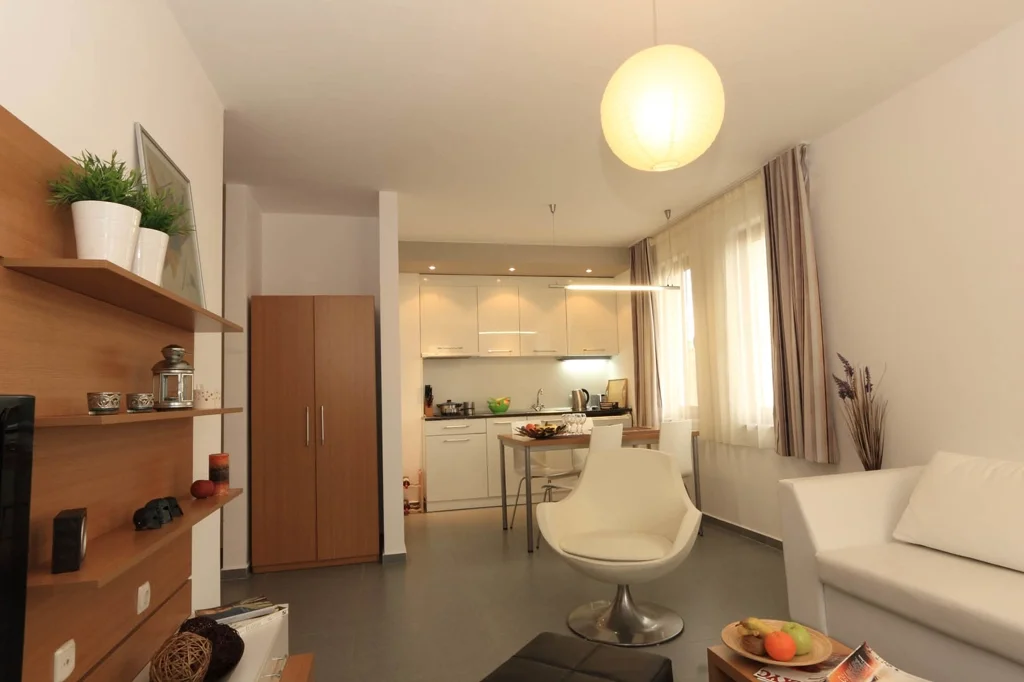 Studio – aproximativ 30 mp, capacitate maximă 2 persoane, cu pat dublu și posibilitate de pat suplimentar (canapea extensibilă sau pat pliant la cerere). Dotat cu aer condiționat individual, televiziune prin satelit, Wi-Fi gratuit, fierbător și o chicineta complet echipată (plite, frigider, prăjitor de pâine, cuptor cu microunde, tacâmuri, oale și tigăi – gătitul este permis). Dispune de mașină de spălat proprie, balcon, baie cu cabină de duș, prosoape și produse cosmetice; uscătorul de păr este disponibil la cerere la recepție. Pardoseala este acoperită cu plăci ceramice, curățenia se efectuează zilnic.