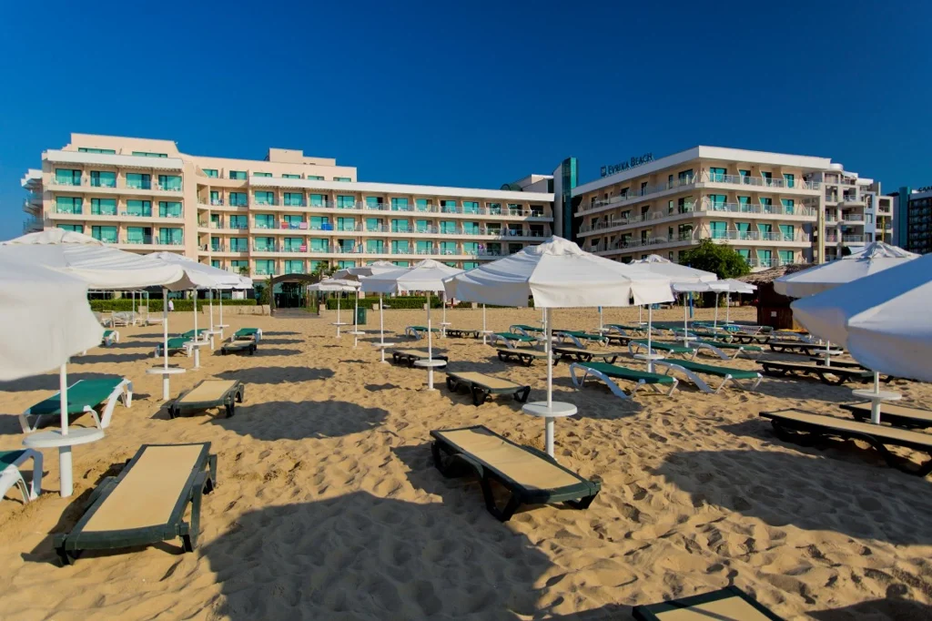 Unul dintre cele mai mari atuuri ale acestui hotel este poziția sa privilegiată: direct pe plajă, cu acces imediat la nisipul fin și la apa mării. Nu aveți nevoie de transfer sau de o plimbare pentru a ajunge la mare – plaja vă așteaptă la câțiva pași de hotel. Față de centrul stațiunii Sunny Beach, hotelul se află la aproximativ 1.500 de metri, o distanță comodă pentru cei care doresc să exploreze zona. Sunny Beach este una dintre cele mai populare stațiuni de pe litoralul bulgar, cu o ofertă variată de magazine, restaurante și viață de noapte, accesibile cu ușurință.