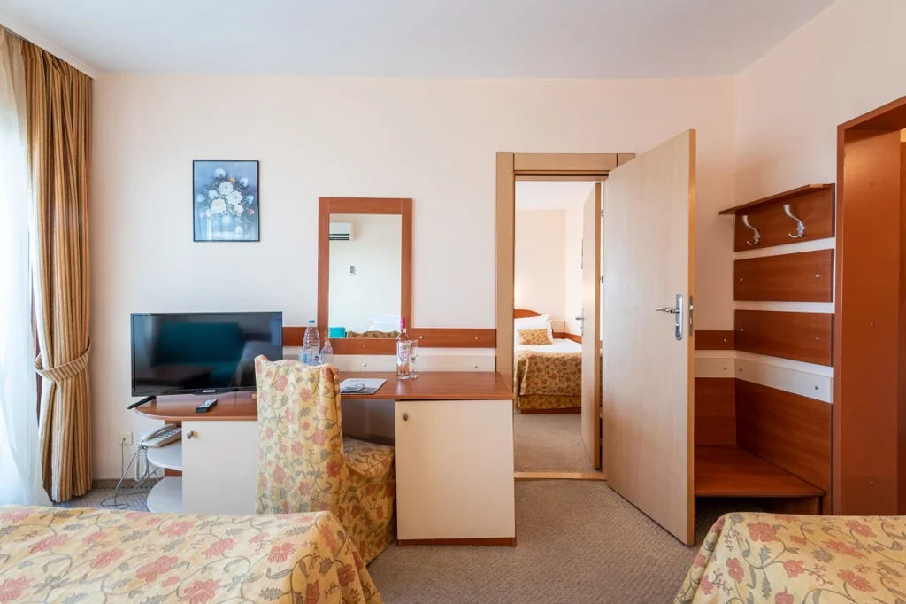 Camera Familială – configurată cu două dormitoare conectate printr-o ușă comunicantă, camera familială este soluția perfectă pentru familii cu copii sau grupuri mai mari, putând găzdui între 2+2 și 3+1 persoane. Dotările sunt identice cu cele ale camerei duble: aer condiționat individual, TV prin cablu, Wi-Fi gratuit, seif, balcon și baie cu duș complet echipată. Flexibilitatea oferită de ușa comunicantă asigură atât intimitate, cât și proximitatea necesară pentru familiile cu copii mici.