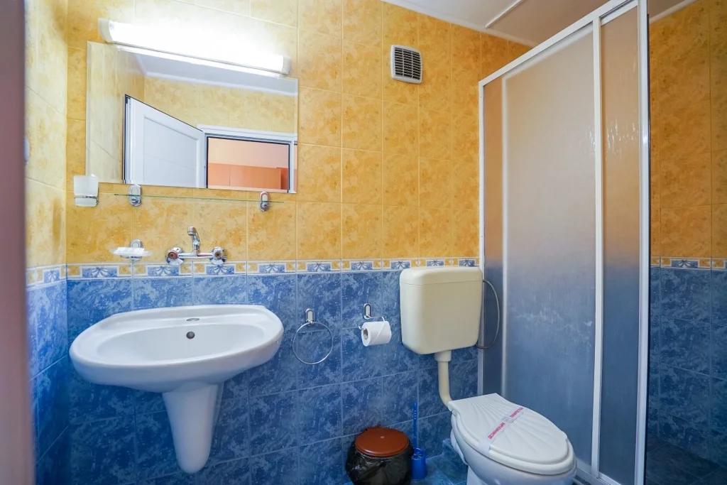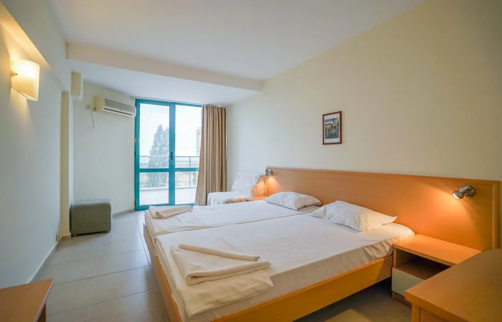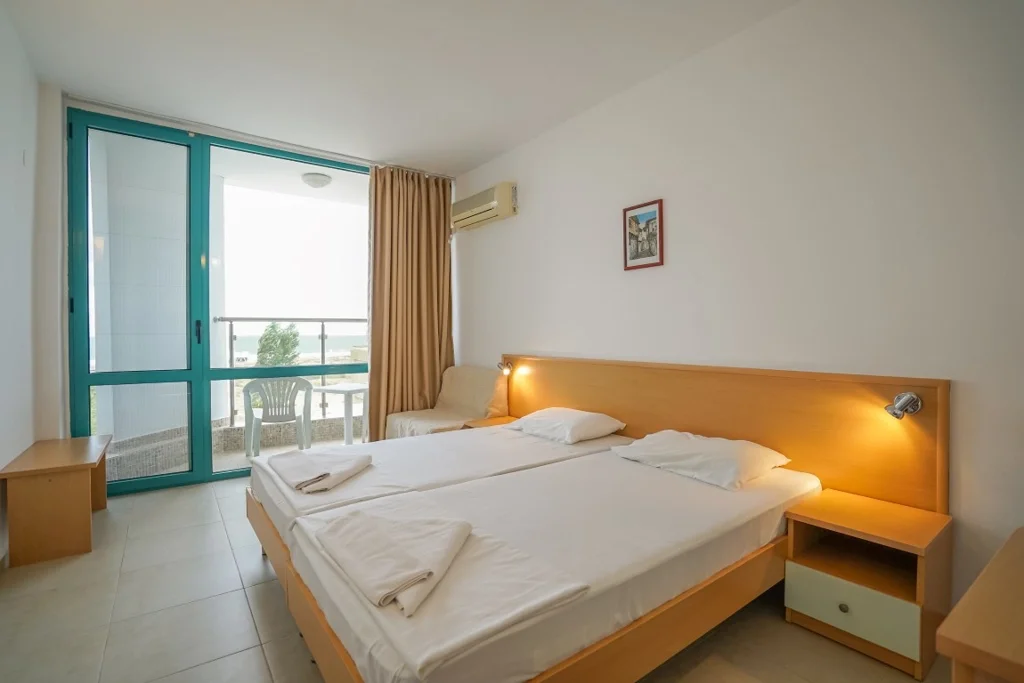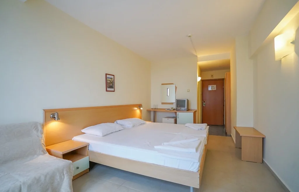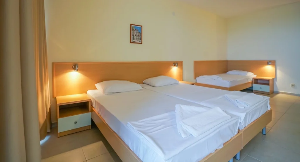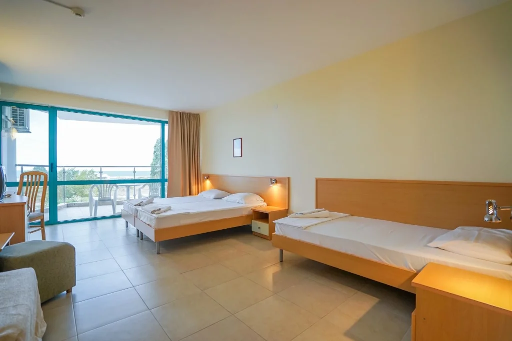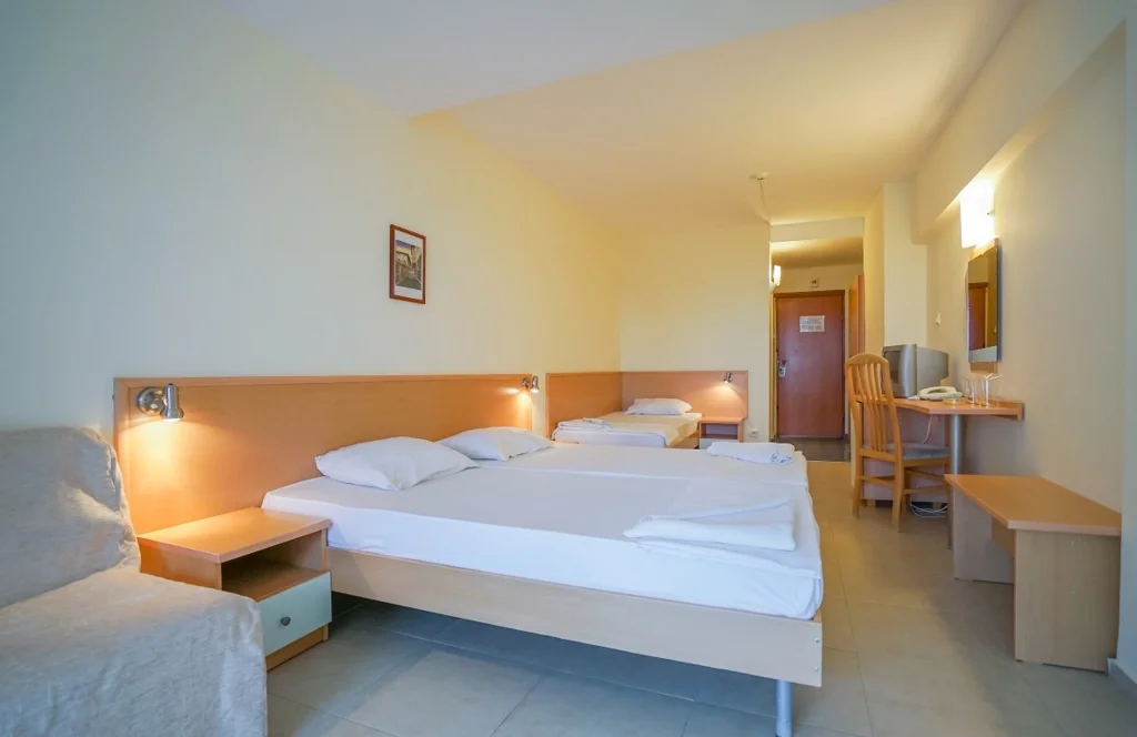 Camera Triplă – aproximativ 32 m², cu capacitate flexibilă: până la 3 adulți + 1 copil, 4 adulți sau 2 adulți + 2 copii, plus posibilitatea unui pat suplimentar (fotoliu extensibil). Și aceasta beneficiază de vedere la mare, aer condiționat individual, televizor prin satelit, mini-frigider, telefon, Wi-Fi gratuit, fier de călcat și balcon mobilat. Baia include duș, uscător de păr și prosoape, iar serviciile de curățenie sunt identice cu cele de la camera dublă. Renovată în 2025, camera triplă este soluția perfectă pentru familiile cu copii care doresc spațiu generos.